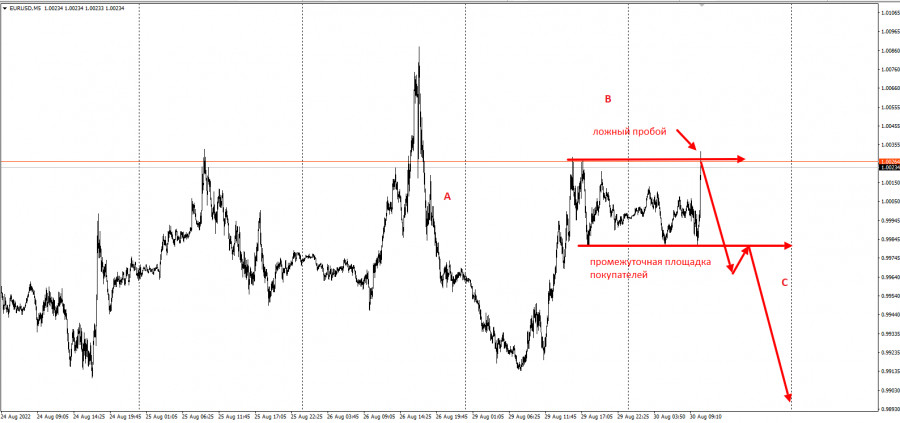 Торговая идея по EURUSD на понижение с коротким стопомИнстаФорекс - Instaforex, 3 года назад Добрый день, уважаемые трейдеры! Представляю вашему вниманию торговую идею по EURUSD Итак, после выступления Пауэлла рынки (как фондовые, так и валютные) продолжают откатывать, создавая хорошие возможности среднесрочным трейдерам для захода в позиции. Пара EURUSD так же не была исключение и на данный момент откатила на 38,2 по "Фибо" и продолжает находиться в трёхволновой структуре: На меньшем масштабе наблюдаем небольшой аукцион, с довольно чёткой границей со стопами покупателей на уровне 0,99800. Если цена не закрепится выше 1,00300, можно рассмотреть сценарий ложного пробоя по следующей схеме: Фактически имеем трёхволновую структуру "АВС", где волной А выступает пятничная шортовая инициатива. |