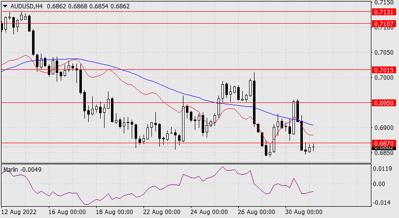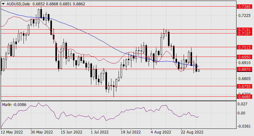 Прогноз по AUD/USD на 31 августа 2022 годаИнстаФорекс - Instaforex, 3 года назад Австралийский доллар вчера предпринял быстрый рост к целевому уровню 0.6950, отработал его и обвалился так же резко, как и подрос. По итогу дня «австралиец» потерял 46 пунктов. Дополнительное давление на AUD/USD оказал сырьевой рынок – нефть подешевела на 4,82%, железная руда на 3,82%. Осциллятор Марлин на daily в стабильной нисходящей позиции. Теперь цена пытается закрепиться под целевым уровнем 0.6870. Цель 0.6755 фактически открыта.