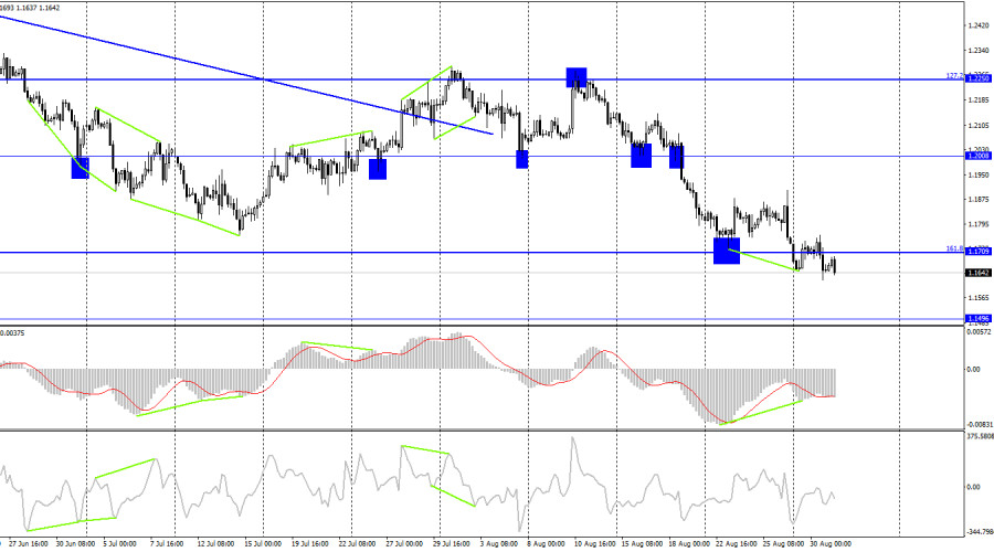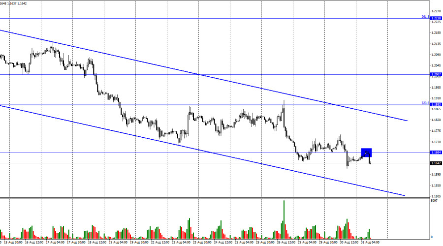 Добрый день, уважаемые трейдеры! На часовом графике пара GBP/USD выполнила во вторник новое закрепление под уровнем 1,1684, поэтому вероятность дальнейшего падения британца в направлении уровня Фибо 423,6% - 1,1306 выросла. Нисходящий трендовый коридор продолжает характеризовать настроение трейдеров, как «медвежье», и я не жду роста британца до закрытия его котировок над коридором. В Великобритании на этой неделе информационный фон практически отсутствует. Первый и единственный отчет выйдет завтра, и это будет индекс деловой активности в секторе производства за август. В США с новостями на этой неделе тоже все плохо. Первый отчет выйдет сегодня, и это будет отчет ADP, который покажет изменение числа рабочих в США. Некоторые считают этот отчет предвестником Nonfarm Payrolls, но на практике их показания очень редко совпадают, а трейдеры предпочитают отрабатывать именно пэйроллы, а не ADP. Рецессия в Великобритании, похоже, действительно начнется в этом году. Пока что трейдеры увидели лишь одно сокращение ВВП, во втором квартале он упал на 0,1% кв/кв. Тем не менее чуть ранее Эндрю Бейли предупредил, что рецессия начнется во втором полугодии и продлится не менее пяти кварталов. С этим мнением согласны аналитики Goldman Sachs. Они также считают, что рецессия будет серьезной, а прогнозы могут быть пересмотрены в худшую сторону, если цены на энергоносители продолжат расти. Напомню, что в данное время цены на газ и электроэнергию бьют все рекорды, а, по мнению большинства аналитиков, это далеко не конец роста цен. Также в Goldman Sachs считают, что рецессия может быть затяжной, домохозяйства будут тратить свои сбережения в меньшей степени, а фискальная помощь от государства может быть меньше, чем предполагается сейчас. Экономика Великобритании может сократиться в следующем году на 3,4%. Также будет падать и промышленное производство. Новости плохие для фунта, но напомню, что в США рецессия - тоже не нечто призрачное, она уже началась. Тем не менее трейдеры пока предпочитают покупки доллара. На 4-часовом графике пара выполнила новый разворот в пользу валюты США и закрепление под уровнем Фибо 161,8% - 1,1709. Таким образом, процесс падения котировок может быть продолжен в направлении следующего уровня 1,1496, который является ближайшей целью. Новых назревающих дивергенций сейчас не наблюдается ни у одного индикатора. Большое значение имеет нисходящий трендовый коридор на часовом графике. Отчет Commitments of Traders (COT):