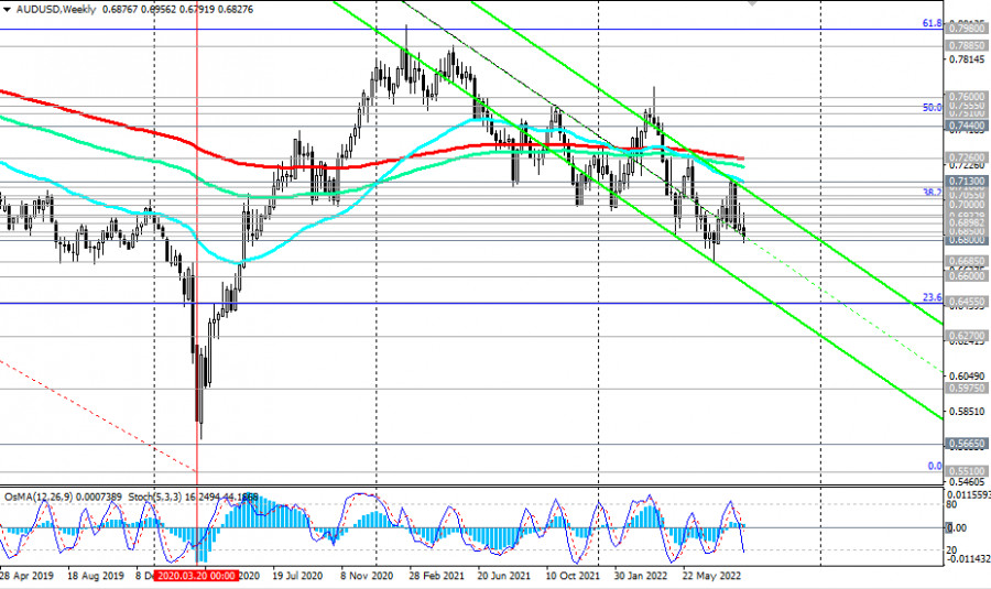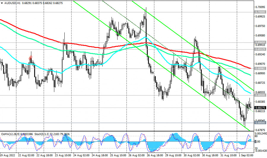 AUD/USD: технический анализ и торговые рекомендации на 01.09.2022ИнстаФорекс - Instaforex, 3 года назад Как мы отметили в нашем сегодняшнем «Фундаментальном анализе», на момент публикации данной статьи AUD/USD торгуется вблизи отметки 0.6827, оставаясь в зоне медвежьего рынка ниже ключевых уровней сопротивления 0.7100 (ЕМА200 на дневном графике), 0.7260 (ЕМА200 на недельном графике) и сохраняя склонность к дальнейшему снижению, в том числе «на фоне продолжающегося повышения процентных ставок ФРС и более сдержанного подхода РБА к данному процессу».Вероятнее всего, после ретеста и пробоя «круглого» уровня поддержки 0.6900 AUD/USD продолжит снижаться внутрь нисходящего канала на недельном графике. Его нижняя граница проходит ниже отметки 0.6600 и ниже локального 2-летнего минимума 0.6685, достигнутого в прошлом месяце. В альтернативном сценарии и после пробоя уровней сопротивления 0.6898, 0.6933 AUD/USD направится в сторону уровней сопротивления 0.7100, 0.7130. Пробой уровня сопротивления 0.7260 вновь выведет AUD/USD в зону долгосрочного бычьего рынка. В основном же сценарии ожидаем снижения AUD/USD. *) об особенностях торговли парой AUD/USD см. в статье AUD/USD: валютная пара (характеристики, рекомендации) Уровни поддержки: 0.6800, 0.6700, 0.6685, 0.6660, 0.6500, 0.6455, 0.6270, 0.5975, 0.5665, 0.5510 Уровни сопротивления: 0.6850, 0.6898, 0.6933, 0.6945, 0.7000, 0.7055, 0.7100, 0.7130, 0.7200, 0.7260