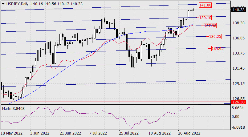 Прогноз по USD/JPY на 5 сентября 2022 годаИнстаФорекс - Instaforex, 3 года назад Доллар против японской йены продолжает рост, но разворотные признаки индикаторов проявляются уже сильнее. На дневном графике это разворот осциллятора Марлин. Цена пока не достигла целевого уровня 141.00 по линии ценового канала старшего таймфрейма. У пары ещё есть силы для отработки данного уровня, после чего возможен уход цены в среднесрочную коррекцию. Целью коррекции может стать район вложенной линии ценового канала 137.90. Закрепление цены под линией Крузенштерна на много усложнит вид ожидаемой коррекции, возможно, это будет продолжительный боковик.