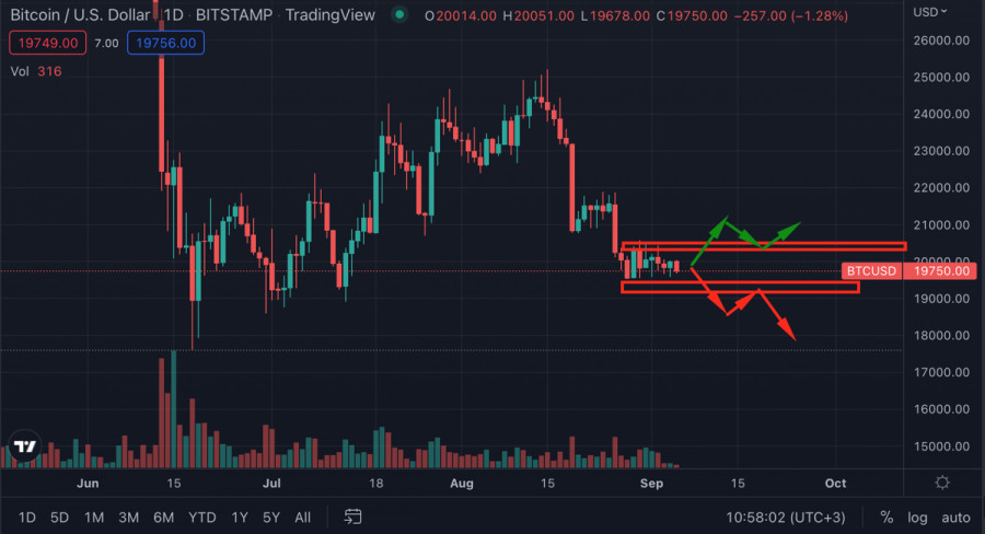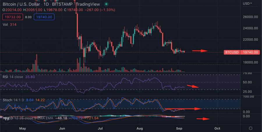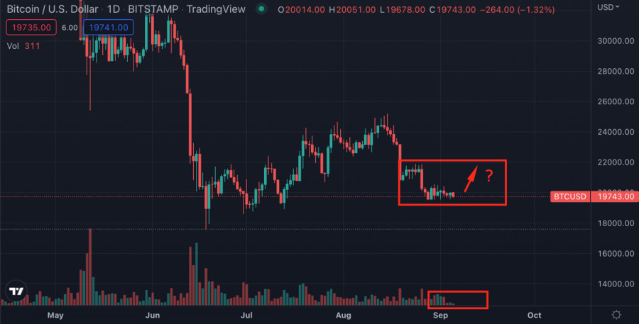 Bitcoin продолжает затяжную консолидацию: стоит ли ждать восходящего движения криптовалюты?ИнстаФорекс - Instaforex, 3 года назад После пробоя ключевого уровня поддержки на отметке $20,8k цена Биткоина консолидируется в районе $20k. За прошедшие выходные на дневном графике криптовалюты образовались неуверенные свечи "доджи", что ярко подчеркивает низкие объемы торгов. Цена Биткоина уже более двух недель находится в стадии консолидации, а определенная категория инвесторов успешно собирает ликвидность с разных ценовых диапазонов. Мы однозначно можем утверждать, что котировки BTC/USD нащупали крепкое дно вблизи отметки $19,5k. Следовательно, выход из консолидационного диапазона должен произойти в восходящем направлении. Помимо уверенной защиты важного ценового уровня, на рынке появились фундаментально позитивные новости, которые могут стать катализатором для роста Биткоина. Уровень безработицы в США вырос до 3,7% при прогнозе 3,5%. Рынок труда – один из основных факторов, подтверждающих рецессию экономики Америки. Следовательно, ФРС может пересмотреть монетарную политику или сделать локальное послабление для стабилизации ситуации на рынке труда. Кроме того, в августе сложность майнинга увеличилась на 10%, что косвенно подтверждает преодоление кризиса энергоресурсов. Santiment также подтверждает сохранение покупательских настроений на рынке. Количество кошельков с балансом 100 - 10 000 BTC продолжает расти. Учитывая это, вполне вероятно предположить, что Биткоин ожидает локальный восходящий рывок. Однако технические метрики на дневном графике продолжают указывать на отсутствие покупательского интереса. Стохастический осциллятор с 18 августа находится в зоне перепроданности, что указывает на отсутствие бычьих импульсов и объемов покупательских торгов. По состоянию на 5 сентября метрика сформировала очередное медвежье пересечение. Метрика RSI также движется в нисходящем направлении. Учитывая плачевное положение технических метрик, возникает вопрос: почему цена не падает, а консолидируется? Основная проблема заключается в торговой активности покупателей. Показатель находится на самом дне, что не позволяет цене достигать локальных максимумов. При этом объемы продаж также находятся на низком уровне, из-за чего медведи не в состоянии пробить ключевые области поддержки без влияния фундаментальных факторов. Другими словами, на текущем этапе рынка любое значительное ценовое движение Биткоина завязано на внешних факторах. Важно также учитывать фактор понедельника, когда основные рынки только разогреваются перед стартом торговой недели. Учитывая это, можно ожидать попытку Биткоина взобраться выше $20k по итогам сегодняшнего торгового дня. Однако и здесь есть свои проблемы. Головная боль Биткоина в виде капитуляции майнеров продолжается. Индустрия адаптировалась к новым реалиям и ценам на энергоресурсы, но низкая ликвидность на рынке вынуждает их распродавать свои запасы. За последнюю неделю майнеры реализовали более 3000 BTC, что негативно скажется на краткосрочных бычьих целях Биткоина. Кроме того, BBG предупреждает, что рынок закладывает 70% вероятность повышения ключевой ставки в сентябре на 70 базисных пунктов. Сдерживающих факторов для роста Биткоина предостаточно, а потому надеяться на успешную реализацию бычьего импульса не стоит. Однако 