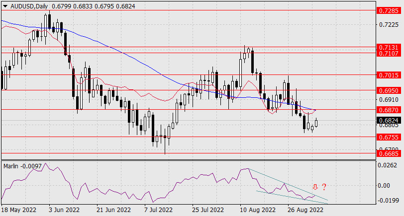 Прогноз по AUD/USD на 6 сентября 2022 годаИнстаФорекс - Instaforex, 3 года назад Вчера и сегодня утром австралийский доллар показывает рост. Структурно это рост коррекционный, он может завершиться на сильном уровне совпадения целевого уровня 0.6870 и линии Крузенштерна. Если у осциллятора Марлин верхняя граница понижающегося клина окажется действенной, то разворот цены вниз может произойти уже от текущих уровней сегодня. Она и может обеспечить разворот цены вниз в ближайшее время. Но осциллятор Марлин в положительной области и это признак продолжения роста к цели 0.6870. Следим за развитием событий. |