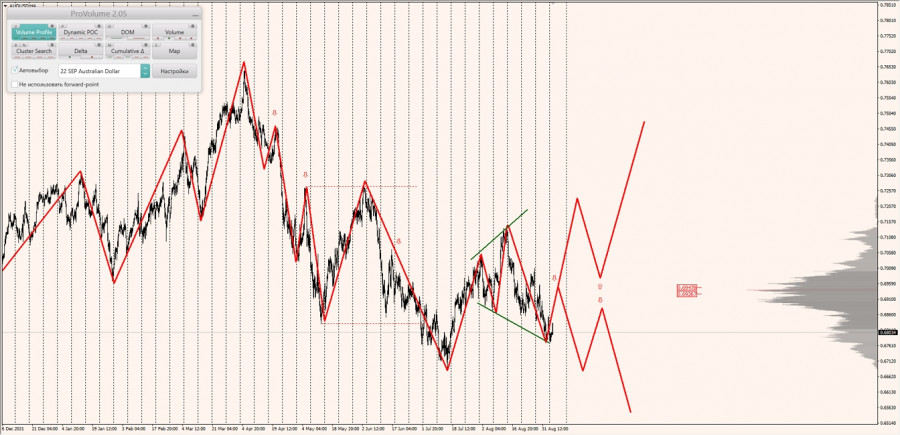 Долгосрочная тенденция: временная неопределенность. Максимальное скопление объемов текущего контракта расположено в диапазоне по котировкам 0.69267-0.69478. В настоящий момент по паре совершаются инвестиционные операции ниже, указывая на силу продавцов.