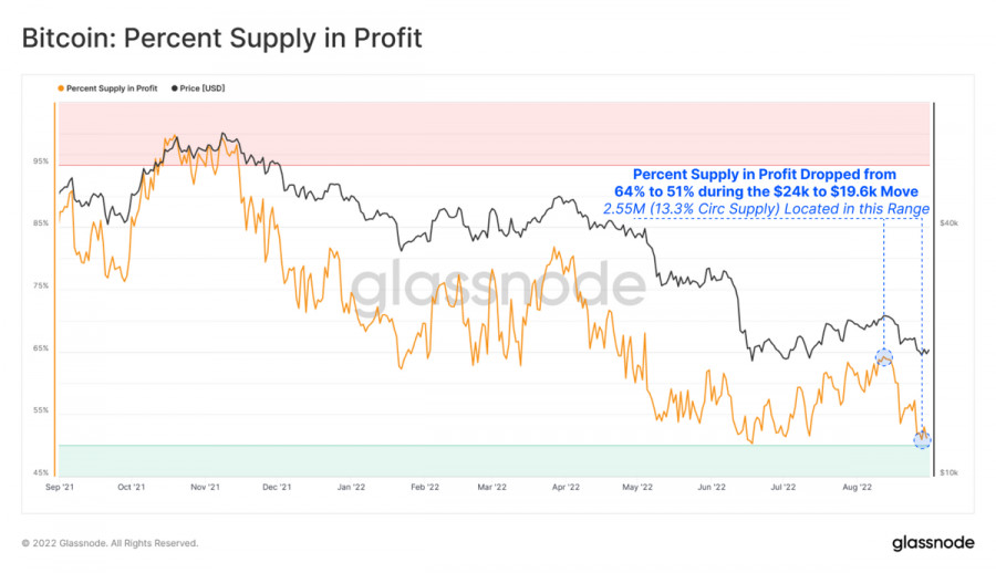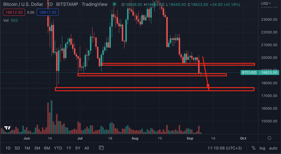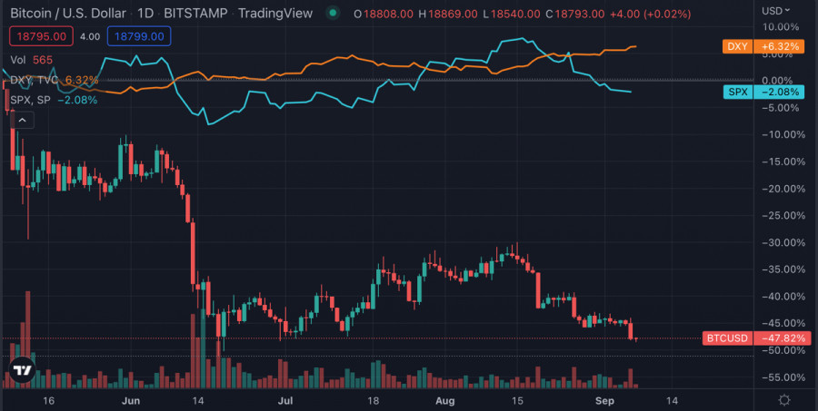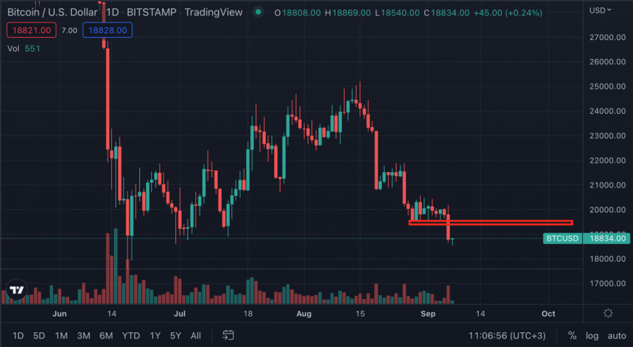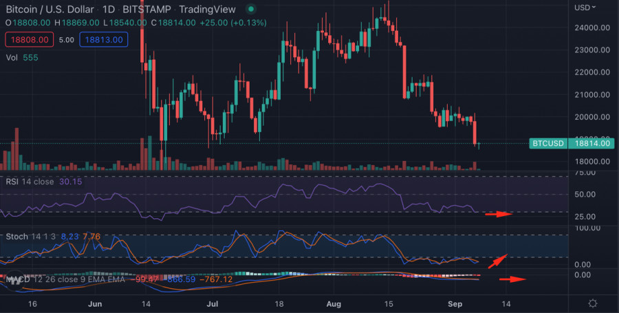 Биткоин приближается к локальному дну: чего ждать от криптовалюты в ближайшее время?ИнстаФорекс - Instaforex, 3 года назад Последние десять дней Биткоин находился в стадии консолидации при рекордно низких объемах торгов. После продолжительного периода накопления цена криптовалюты совершила нисходящий пробой уровня $19k. В результате за последние сутки котировки BTC снизились на 6%, а недельное падение достигло 7,5%. Учитывая фундаментальный и технический фон, падение капитализации Биткоина может продолжиться. Среди наиболее вероятных сценариев стоит выделить ретест уровня $17,7k либо дальнейшее снижение цены Bitcoin и обновление локального дна. Главная криптовалюта уверенно реализовала медвежий сценарий, который мы упоминаем уже около недели. Цене Биткоина не удалось закрепиться выше $20,8k, что означало бы реализацию бычьего импульса. В результаты актив продолжает нисходящее движение, после успешного пробоя ключевой области поддержки $20,5k-$21k. Котировки BTC/USD в очередной раз коснулись зоны поддержки на $19,5k, после чего произошел медвежий пробой уровня и движение цены до отметки $18,7k. Нисходящее пике криптовалюты спровоцировало ликвидацию более 102 тысяч позиций трейдеров на общую сумму $356 миллионов. На дневном графике Биткоин пробил ключевую зону поддержки на $19,5k, после чего совершил крутое нисходящее пике до области $18,5k-$18,7k. По итогам 6 сентября криптовалюты сформировала явный паттерн "медвежьего поглощения". Это явный медвежий сигнал, указывающий на завершение консолидационного периода и полную доминацию продавцов. Текущая область поддержки в районе $18,5k-$18,7k является финальным рубежом сопротивления покупателей на пути цены к ретесту локального дна. При сохранении медвежьих настроений высока вероятность повторного снижения к $17,7k и обновлении локального дна рынка. На дневном графике Bitcoin видны сигналы к активизации покупателей. Индекс относительной силы вплотную приблизился к зоне перепроданности, но не спешит покидать ее, что может указывать на начало бокового движения. Потенциально это может свидетельствовать о снижении давления продавцов и растущих объемах покупок BTC. Стохастический осциллятор продолжает безнадежные попытки выйти из зоны перепроданности. Метрика демонстрирует формирование очередного бычьего пересечения, однако, учитывая общую ситуацию на рынке, нет оснований полагать, что бычий импульс будет успешно реализован. Несмотря на локальный позитив дневного графика, вероятность дальнейшего падения цены Биткоина сохраняется. Главным катализатором вероятного падения цены Биткоина до уровня $17,7k могут стать краткосрочные инвесторы. Согласно отчету Glassnode, во время консолидации Биткоина в районе $20k существенное число краткосрочных инвесторов приобрели актив. После падения цены ниже $20k, а впоследствии и $19k, объемы монет BTC в убытке значительно выросли. Согласно аналитике Glassnode, процент убыточных монет вырос на 13%, и 60% из новоубыточных коинов находятся в руках краткосрочных инвесторов. Это повышает риски того, что спекулянты распродадут объемы Биткоина, что спровоцирует падение цены до уровня локального дна и ниже. Подкрепляем прогнозы о негативном ближайшем будущем Биткоина графиком корреляции с индексом S&P 500 и доллара США. Как мы видим, фондовый индекс и BTC сохраняют прочную связь и планомерно движутся в сторону
