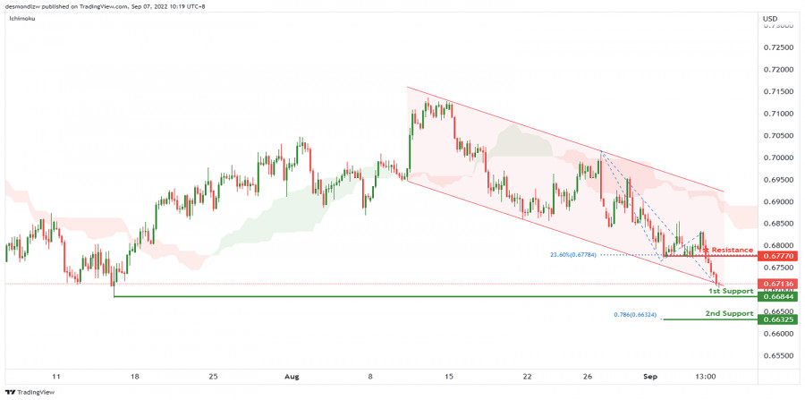 AUD/USD: вероятность дальнейшего медвежьего тренда 7 сентября 2022ИнстаФорекс - Instaforex, 3 года назад На 4-часовом графике цена движется ниже облака Ишимоку внутри нисходящего канала. Мы предполагаем дальнейшее нисходящее движение, в результате которого цена может упасть от 1-ой поддержки на уровне 0.66844, что соответствует разворотному минимуму, до 2-ой поддержки на уровне 0.66325, где находится коррекция Фибоначчи 78.6%. Альтернативный сценарий: цена может повыситься до 1-ого сопротивления на уровне 0.67770, где расположен откат Фибоначчи 23.6%. Рекомендации по торговле Вход в сделку: 0.66844 Причина входа в рынок: разворотный минимум Take Profit: 0.66325 Причина срабатывания take profit: коррекция Фибоначчи 78.6% Stop Loss: 0.67770 Причина срабатывания stop loss: откат Фибоначчи 23.6% Материал предоставлен компанией InstaForex - www.instaforex.com |