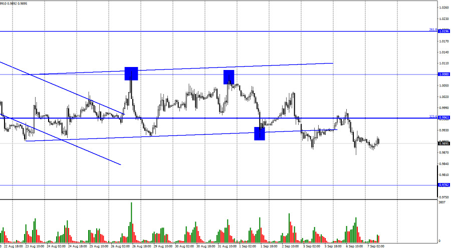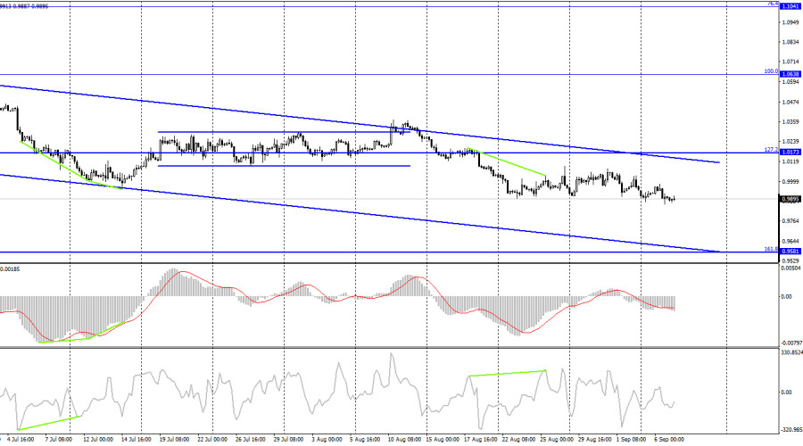 EUR/USD. 7 сентября. Два важных дня для европейской валютыИнстаФорекс - Instaforex, 3 года назад Добрый день, уважаемые трейдеры! Пара EUR/USD во вторник выполнила новый разворот в пользу американской валюты и начала новое падение в направлении уровня 0,9782. Но и на этот раз оно продолжалось недолго, так как уже сегодня был выполнен разворот в пользу валюты ЕС. Таким образом, трейдеры продолжают раскачивать рынок из стороны в сторону и ни быки, ни медведи не имеют сейчас явного преимущества. Это суждение было бы справедливым на 100%, если бы пара не находилась около своих лоу за 20 лет. Поэтому медведи, конечно же, имеют полную власть на рынке, но в последние недели не усиливают свой нажим на европейскую валюту. Евро не падает или падает с большим трудом. Я уже настолько привык к тому, что евровалюта постоянно снижается, что подсознательно вариант с его возможным ростом даже не рассматриваю. Хотя сегодня и завтра – важные дни. Сегодня выйдет отчет по ВВП за второй квартал, а завтра – состоится заседание ЕЦБ. На фоне непрекращающихся разговоров о рецессии в Евросоюзе можно было бы ожидать значительного сокращения ВВП во втором квартале, однако трейдеры ожидают роста на 0,6% кв/кв, а рецессия еще может начаться позже. Если их ожидания сбудутся, то европейская валюта не получит новых причин для падения. Завтра же и вовсе она может показать довольно сильный рост, если ЕЦБ, как все того сейчас ожидают, повысит ставку сразу на 0,75%. Странно лишь то, что трейдеры-быки до сих пор не отрабатывают это событие, так как о повышении ставки знают уже все, а значит причины покупать евровалюту уже сейчас имеются. Я опасаюсь, как бы вместо роста европейской валюты в четверг мы не увидели его новое падение, а результаты заседания ЕЦБ не были полностью проигнорированы. Так или иначе, у нас есть сейчас закрытие под боковым коридором, поэтому вероятность падения выше, чем вероятность роста. Высокая вероятность энергетического кризиса может затмить неплохой ВВП и повышение процентной ставки ЕЦБ. На 4-часовом графике пара выполнила разворот в пользу валюты США и закрепление под уровнем коррекции 127,2% - 1,0173. Таким образом, процесс падения может быть продолжен в направлении уровня Фибо 161,8% - 0,9581. Нисходящий трендовый коридор по-прежнему характеризует настроение трейдеров как «медвежье». Новых назревающих дивергенций сегодня не наблюдается ни у одного индикатора. Отчет Commitments of Traders (COT):