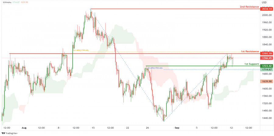 ETH/USD: вероятность повышения котировок 12 сентября 2022ИнстаФорекс - Instaforex, 3 года назад На 4-часовом графике цена движется выше облака Ишимоку. В рамках бычьего прогноза цена будет повышаться до 1-ого сопротивления на уровне 1 791.19, где также находится откат Фибоначчи 61.8%. Как только мы получим подтверждение, что цена пробила 1-ое сопротивление, мы можем ожидать, что бычий импульс приведет котировки ко 1-му сопротивлению на уровне 2 034.14, где находится разворотный максимум. Альтернативный сценарий: цена может упасть до 1-ой поддержки на уровне 1 723.42, где находится поддержка, сформированная во время отката, и откат Фибоначчи 23.6%. Рекомендации по торговле Вход в сделку: 1 791.19 Причина входа в рынок: сопротивление и откат Фибоначчи 61.8% Take Profit: 2 034.14 Причина срабатывания take profit: сопротивление разворотного максимума Stop Loss: 1 723.42 Причина срабатывания stop loss: поддержка, сформированная во время отката, и откат Фибоначчи 23.6% Материал предоставлен компанией InstaForex - www.instaforex.com |