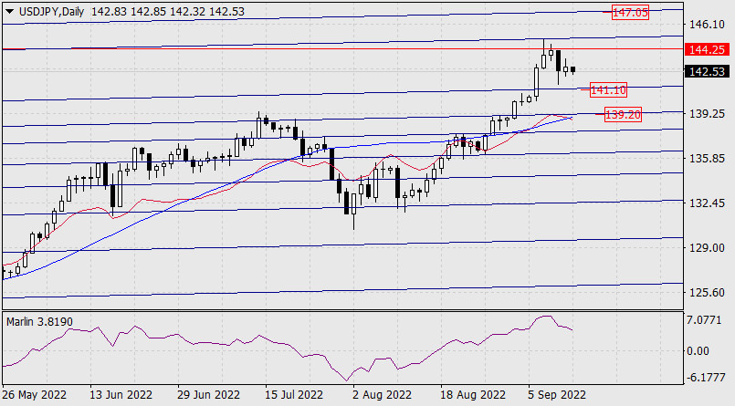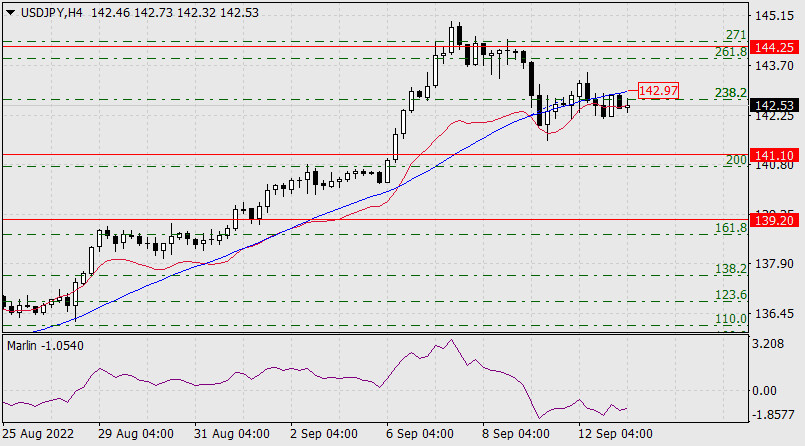 Прогноз по USD/JPY на 13 сентября 2022 годаИнстаФорекс - Instaforex, 3 года назад К текущему моменту истекают вторые сутки консолидации йены в области закрытия 9-го сентября. Вероятно, цена готовится к преодолению сопротивления 144.25 с тем, чтобы отработать высокую цель 147.05. Осциллятор Марлин за время этой консолидации вышел из зоны перекупленности и может продолжать рост.