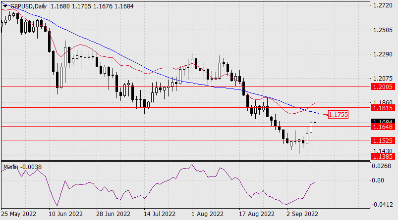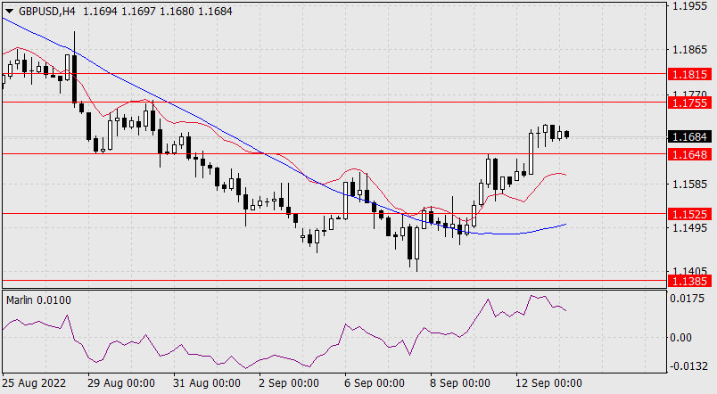 Прогноз по GBP/USD на 13 сентября 2022 годаИнстаФорекс - Instaforex, 3 года назад За вчерашний день фунт стерлингов подрос на 93 пункта, был преодолён уровень сопротивления 1.1648. Теперь цена может отработать сопротивление индикаторной линии Крузенштерна (1.1755). В этот же момент сигнальная линия осциллятора Марлин может развернуться вниз после касания границы с областью роста. Снижение в этом случае ждём ниже 1.1525. Это основной сценарий. Выход цены над сопротивление 1.1815 открывает цель 1.2005.