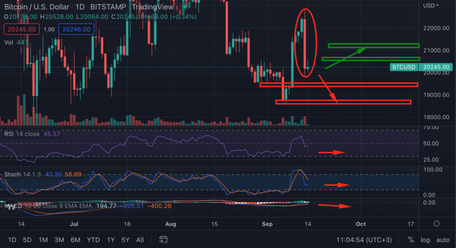 Отчеты CPI обрушили хрупкое восходящее движение Биткоина: чего ждать от криптовалюты дальше?ИнстаФорекс - Instaforex, 3 года назад Биткоин, вопреки многим ожиданиям, успешно провел вторую часть прошлой недели. Активу удалось защитить уровень $18,5k-$19k и возобновить восходящее движение. Формирование крупнейшей зеленой свечи за последние три месяца давали надежды на сильный бычий импульс. Вместе с Bitcoin росли фондовые индексы, в том числе S&P 000 и NASDAQ. Индекс доллара США корректировался после достижения очередного максимума, что давало высокорисковым активам время для роста. Аналитики State Treet сообщают, что институциональные инвесторы сохраняют веру в перспективы и ценность криптовалют. Основное их внимание нацелено на Ethereum перед слиянием, из-за чего Биткоин выпадает из инвестиционной повестки. По мнению Santiment, локальная недооценка BTC спровоцировала сильный отскок к уровню $22k. Публикация CPI и реакция крипторынкаБольшинство факторов указывало высокую вероятность достижения BTC локального максимума на отметке $25k. Жирную точку на ожиданиях рынка поставила публикация динамики индекса потребительских цен. Показатель снизился с 8,5% до 8,3% при прогнозе падения до 8,1%. Темпы снижения уровня инфляции оказались ниже прогнозов. Рынок криптовалют и Биткоин отреагировали резко негативно. По состоянию на 14 сентября из топ-30 криптовалют только Litecoin удалось сохранить устойчивость. Капитализация индустрии упала на 6,6%, до $900 миллиардов, а Биткоин за несколько часов потерял 9%. По состоянию на 11:00 BTC/USD закрепилось вблизи уровня поддержки $20,2k. Фондовые индексы также упали – S&P 500 снизился на 4,3% за сутки, что стало крупнейшим падением с июня 2020 года. Технический анализ BTC/USDВ техническом плане криптовалюта достигла локальной зоны поддержки в области $19,8k-$20,2k. По итогам минувших суток Биткоин сформировал паттерн "медвежьего поглощения", что указывает на сохранение тенденции к снижению. Объемы продаж продолжают расти, но технические метрики сигнализируют о локальном развороте. Индекс RSI и стохастик отскочили от области 35-45 и начинают движение по флету, что говорит о консолидации. Бычий сценарийБиткоину крайне важно удержаться выше уровня $20k для того, чтобы сохранить возможность возобновить восходящее движение. При удержании круглой отметки, цена BTC устремится к области сопротивления $20,4k-$20,9k. Успешное прохождение этого отрезка и закрепление выше $21k открывает перед криптовалютой перспективы движения к $22k. Вероятней всего, в ближайшие дни Биткоин будет находиться в стадии консолидации после негативных новостей. Медвежий сценарийШоковое состояние рынка сменится осознанием сложностей борьбы с инфляцией. Вероятней всего, это приведет к снижению инвестиционной активности на рынке криптовалют и переориентация инвесторов на USD-продукты. В более краткосрочной перспективе это будет выражаться в движении цены к ключевой области поддержки $19,5k-$19,9k. Учитывая эффект обновления ETH, можно предположить, что эта зона окажется финальной перед разворотом. Но в случае усугубления медвежьего движения дополнительными негативными факторами цена встретит поддержку на финальном уровне $18,5k-$19k. ИтогиПодводя краткие итоги публикации CPI, можно сказать, что ситуация с ликвидностью и ужесточением монетарной политики не изменится в ближайшие месяцы. Пауэлл заявлял, что действия ФР