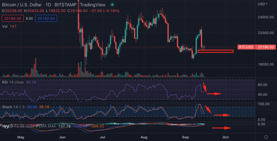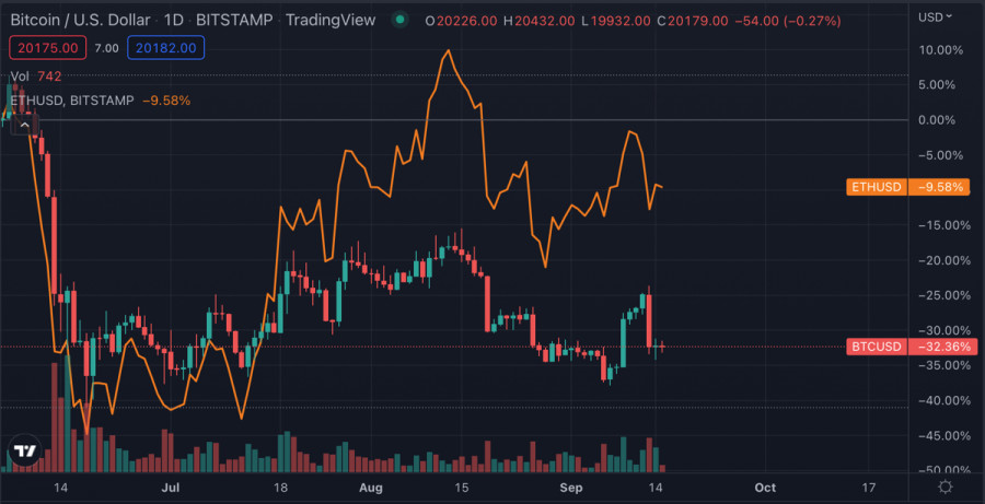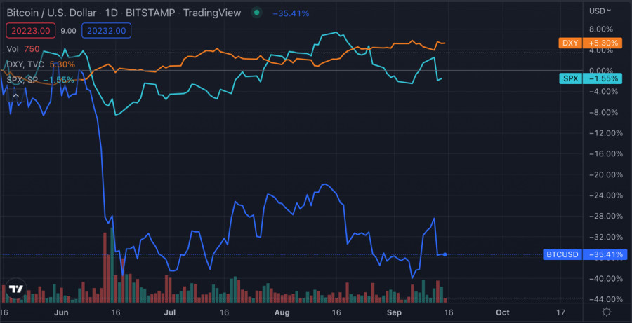 Прогнозы борьбы с инфляцией не оправдываются и криптозима затягивается?ИнстаФорекс - Instaforex, 3 года назад Пока весь мир обсуждает обновление Merge от Ethereum, важно окончательно разобраться с последствиями замедления темпов снижения уровня инфляции. Отчетность по CPI негативно сказалась на крипторынке и вызвала сокращение общей капитализации до уровня $998 миллиардов. Однако это лишь импульсивная реакция инвесторов на плохие новости. Последствия этого процесса в среднесрочной перспективе могут быть губительнее. Инфляция, позиция ФРС и крипторынокЛетом председатель ФРС Джером Пауэлл заявил, что ведомство меняет стратегию повышения ключевой ставки. Регулятор отказался от прогностической модели планирования показателя и решил сфокусироваться на фактических данных. Также Fed заявил, что планирует завершить текущий год с нейтральной ставкой. Заявления Пауэлла позволили убрать элемент неожиданности, сделать политику Федрезерва более прозрачной и дать инвесторам надежду. Рынки восприняли тезисы главы ФРС как переходный момент к постепенному смягчению монетарной политики. Пик таких настроений пришелся на начало августа, когда уровень инфляции снизился сверх ожиданий. Появление проблесков надежды среди бесконечного тумана кризиса ликвидности спровоцировали другие позитивные слухи. Одним из инициаторов позитивных заявлений стал Артур Хейс, который считает, что по мере приближения к ноябрьским выборам в Сенат рынки будут накачивать денежной массой. Замедление темпов снижения уровня инфляции поставили жирную точку на вероятности смены или смягчения текущей политики ФРС. После публикации CPI за август повышение ключевой ставки на 75 базисных пунктов в сентябре – решенный вопрос. Помимо этого, сохраняется текущий порядок движения цены Биткоина и других финансовых инструментов. Новые правила движения цены БиткоинаНедостаточные темпы снижения инфляции вынуждают ФРС сохранять текущий уровень влияния на мировые рынки. Изъятие ликвидности и повышение ключевой ставки для укрепления USD продолжатся. Учитывая это индекс, DXY остается главным финансовым инструментом на ближайшие месяцы. Биткоин продолжает сохранять тесную корреляцию с фондовыми индексами. Учитывая макроэкономическую ситуацию, высокорисковые активы остаются единой категорией маловажных инвестиций на данном этапе. Отсюда следует, что при активной торговле BTC/USD, другими криптовалютами и фондовыми индексами сохраняется правило обязательного анализа DXY. С большой долей вероятности, когда индекс доллара США растет – Биткоин и другие криптовалюты снижаются или движутся по флету. Публикация отчетности CPI вызвала противоположные реакции у BTC и DXY. Обратная корреляция двух активов очевидна и должна стать ключевым элементом активной торговли BTC/USD. Технический анализ BTC/USDБиткоину удалось удержаться на области поддержки $20,1k-$20,2k. Криптовалюта успешно защитила рубеж $19,1k по итогам вчерашнего торгового дня и перешла к стадии консолидации. В ближайшие дни стоит ждать стабилизационного движения цены BTC/USD без существенных импульсных движений. Технические метрики подтверждают такой сценарий развития событий. На дневном графике индекс RSI и стохастический осциллятор совершили резкий разворот в боковом направлении. Индикатор MACD также завершил восходящий рывок и начал движ