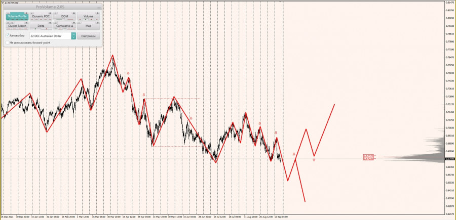 Долгосрочная тенденция: в шорт. Максимальное скопление объемов текущего контракта расположено в диапазоне по котировкам 0.67221-0.67475. В настоящий момент по паре совершаются инвестиционные операции внутри указанного диапазона, указывая на временную неопределенность.