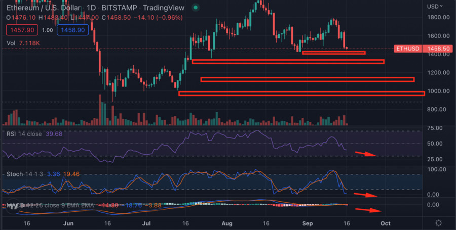Ethereum снижается после успешного обновления Merge: чего ждать от альткоина дальше?ИнстаФорекс - Instaforex, 3 года назад В криптоиндустрии произошло важнейшее за последние 5 лет событие – переход ETH на алгоритм PoS. Вдвойне важно, что вторая по капитализации криптовалюта успешно реализует стратегию по кардинальному изменению процессов майнинга в самый разгар криптозимы. Обновление MergeОбновление Merge принесло эфиру множество преимуществ, которые в долгосрочной перспективе приведут к значительному увеличению институциональных инвестиций. После апдейта ETH станет потреблять на 99,9% меньше электроэнергии. Эмиссия монет альткоина также значительно сократилась, и в следующую минуту выпуск монет криптовалюты упал на 86 ETH. Это означает, что эфириум окончательно стал дефляционным активом, а значит у Биткоина появился серьезный конкурент в борьбе за внимание инвесторов. Ethereum значительно увеличит скорость обработки транзакций – до 100 000 транзакций. Другими словами, обновление Merge в большей степени решит проблему масштабируемости и даст новый толчок для развития секторов DeFi и NFT. Представитель ARK Invest Бретт Уинтон заявил, что после завершения криптозимы Биткоин и Эфириум создадут беспрецедентный бычий импульс для всего рынка. Несмотря на эйфорию от инвесторов по всему миру, ETH начал резко снижаться после обновления. Почему цена Ethereum упала?Главной причиной падение котировок криптовалюты является совокупность фундаментальных негативных факторов. Снижение темпов падение уровня инфляции продолжает оказывать негативное влияние на мировые рынки. Fitch Ratings ухудшило прогноз роста мировой экономики в 2022 году с 2,9% до 2,4%. Это может указывать на недооценку вопроса инфляции и сопутствующих ей проблем. Негативный макротренд влияет на инвестиционные потоки в крипторынок. Аналитики CoinShares зафиксировали крупнейший отток средств из криптофондов с июня 2022 года. В период с 3 по 9 сентября из криптосектора было выведено $63 миллиона. Отток средств из ETH-фондов продолжился третью неделю подряд и составил $61,6 миллиона. Последние несколько недель фиксировались значительные переводы монет ETH на криптовалютные биржи. Часть аналитиков склонялись ко мнению, что инвесторы готовятся фиксировать прибыль после успешного обновления Merge. Были и те, кто считал, что перевод эфира на биржи тревожный знак, свидетельствующий о недоверии инвесторов к обновлению. Технический анализ ETH/USD и прогнозВ результате за минувшие сутки котировки эфира упали на 9%, а недельное падение составило 14%. Криптовалюта пробила ключевой для восходящего тренда уровень поддержки – $1500. ETH/USD замедлило падение при достижении очередного уровня поддержки на $1420. Впоследствии цена локально восстановилась до $1460, но предпосылок к сохранению восстановительного движения нет. Технические индикаторы на дневном графике указывают на сохранение медвежьих тенденций движения цены Ethereum. Стохастический осциллятор и индекс RSI совершили попытку разворота в боковом направлении, но метрикам удалось сохранить нисходящую направленность. Индикатор MACD также движется по красной зоне, что указывает на формирование среднесрочного нисходящего тренда криптовалюты. Учитывая неутешительные прогнозы, можно предположить, что эфир продолжит падение. При пробое уровня $1420, следующую значимую зону поддержки цена встретит $1280-$134
