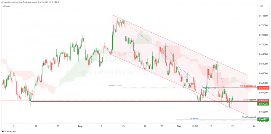 AUD/USD: ожидается дальнейшее развитие нисходящей тенденции. Прогноз на 19 сентября 2022ИнстаФорекс - Instaforex, 3 года назад На 4-часовом графике пара AUD/USD движется в нисходящем канале и ниже индикатора Облака Ишимоку, что указывает на медвежий импульс. Ожидается, что цена может упасть до 1-го уровня поддержки 0.67036, соответствующего предыдущему уровню свинг-лоу. Если 1-й уровень поддержки будет пробит, цена может направиться ко 2-му уровню поддержки 0.66122, соответствующему 100% проекции Фибоначчи. В качестве альтернативы цена может подняться до 1-го уровня сопротивления 067748, который соответствует 38.2% и 23.6% уровням коррекции Фибоначчи. Торговая рекомендация Вход: 0.67036 Условия для входа: предыдущий уровень свинг-лоу Тейк-профит: 0.66122 Условия для фиксации прибыли: 100% проекция Фибоначчи Стоп-лосс: 0.67748 Условия для активации ордера стоп-лосс: 38.2% уровень коррекции Фибоначчи и 23.6% уровень коррекции Фибоначчи Материал предоставлен компанией InstaForex - www.instaforex.com |
