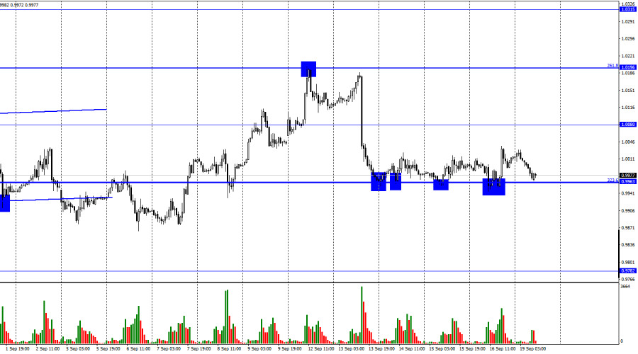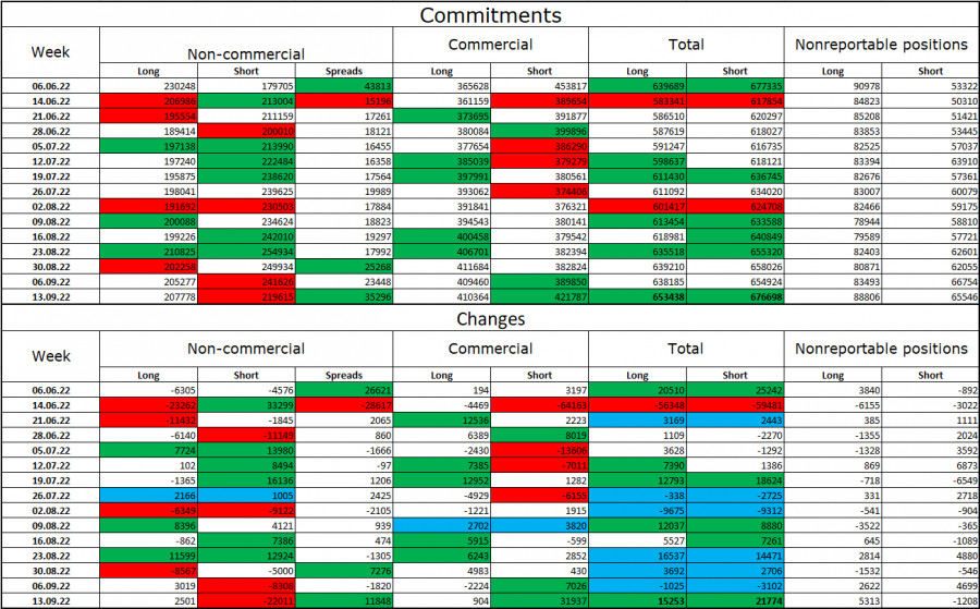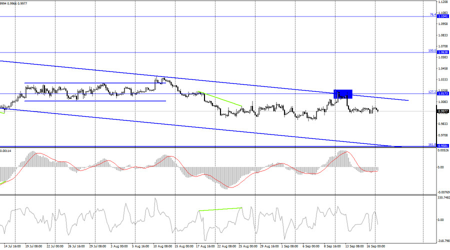 EUR/USD. 19 сентября. Евровалюта застряла на уровне 1,0000 перед заседанием ФРСИнстаФорекс - Instaforex, 3 года назад Добрый день, уважаемые трейдеры! Пара EUR/USD в пятницу выполнила новый отбой от уровня коррекции 323,6% - 0,9963. Этот отбой привел к небольшому росту евровалюты, но уже в понедельник утром котировки выполнили возврат к этому уровню. Таким образом, новый отбой вызовет новый рост евровалюты, а закрытие под 0,9963 - падение евро в направлении уровня 0,9782. Стоит отметить, что европейская валюта большую часть прошлой недели двигалась горизонтально, а фунт в это же время продолжал падение. Что-то остановило трейдеров-медведей от новых распродаж. Но сейчас наиболее важным событием, которое маячит на горизонте, является заседание FOMC, которое начнется завтра. А в среду будут подведены его итоги, и трейдеры уже практически не сомневаются в том, что процентная ставка будет поднята еще на 0,75%. Некоторые даже считают, что ФРС решится на повышение ставки сразу на 1,00%, но я считаю, что этого не произойдет. Инфляция в США все-таки замедляется второй месяц подряд, и нет необходимости в ужесточении темпов повышения ставки. Как может отреагировать пара евро-доллар на это событие? С одной стороны, было бы логично ожидать нового ее падения. Но, с другой стороны, трейдеры в курсе возможного решения ФРС, поэтому уже могли отреагировать на него. Как и всегда, я рекомендую быть готовыми к любому исходу. Заседание ФРС - это всегда очень сложное фундаментальное событие. Иметь значение будет не только решение по ставке, но и комментарии Джерома Пауэлла. А предугадать его комментарии невозможно. Вероятнее всего, он опять заявит, что регулятор будет внимательно следить за инфляцией и реагировать на нее. Однако что это означает? Будущие отчеты по инфляции мы не можем увидеть сейчас, следовательно, ФРС и сама не знает, какие решения будут приняты на следующих заседаниях. Таким образом, я бы сказал так: вероятность нового роста американской валюты велика, но не стоит относиться к нему как к единственно возможному варианту. Сегодня, в понедельник, информационный фон будет отсутствовать, поэтому горизонтальное движение, вероятнее всего, продолжится. На 4-часовом графике пара выполнила отбой от уровня коррекции 127,2% - 1,0173, разворот в пользу валюты США и начала падение в направлении коррекционного уровня 161,8% - 0,9581. Нисходящий трендовый коридор продолжает характеризовать настроение трейдеров, как «медвежье». Закрытие курса пары над коридором может изменить настроение трейдеров на «бычье» на долгое время, но очередная попытка закончилась провалом. Отчет Commitments of Traders (COT):