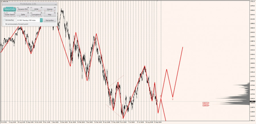 Долгосрочная тенденция: в шорт. Максимальное скопление объемов текущего контракта расположено в диапазоне по котировкам 11693.8-11817.2. В настоящий момент по Nasdaq совершаются инвестиционные операции внутри указанного диапазона, указывая на временную неопределенность.