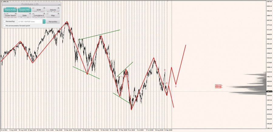 Альтернативный сценарий: при закреплении котировок индекса SNP500 выше зоны 1/2 (3941.36) при откатах искать покупки по паттерну в новом диапазоне выгодных цен с целями: обновление максимумов и тестирование нижней границы НКЗ (4031.36).