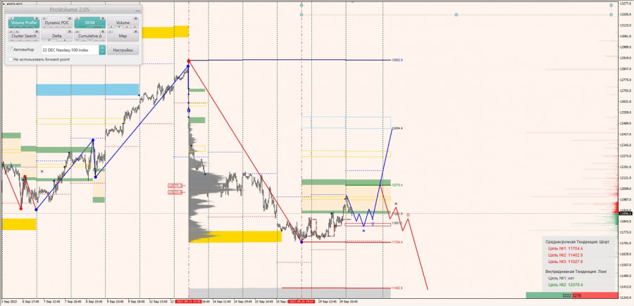 Среднесрочная тенденция: в шорт. Максимальное скопление объемов среднесрочной тенденции расположено в диапазоне по котировкам 12033.9-12077.2. В настоящий момент по Nasdaq совершаются инвестиционные операции ниже, указывая на силу продавцов. Есть закрытие выше зоны a после удержания НКЗ и технический слом основного среднесрочного тренда, что даёт нам право внутри дня поработать в лонг, вплоть до НКЗ голубого цвета (12454.4).