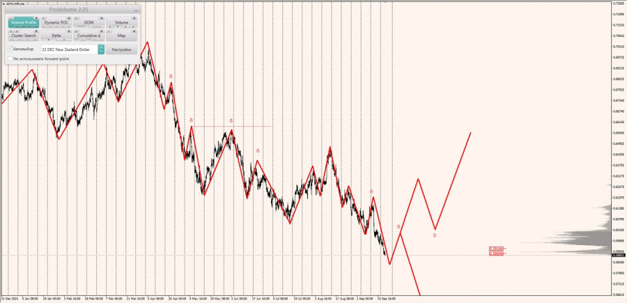 Долгосрочная тенденция: в шорт. Максимальное скопление объемов текущего контракта расположено в диапазоне по котировкам 0.59317-0.59688. В настоящий момент по паре совершаются инвестиционные операции ниже, указывая на силу продавцов.