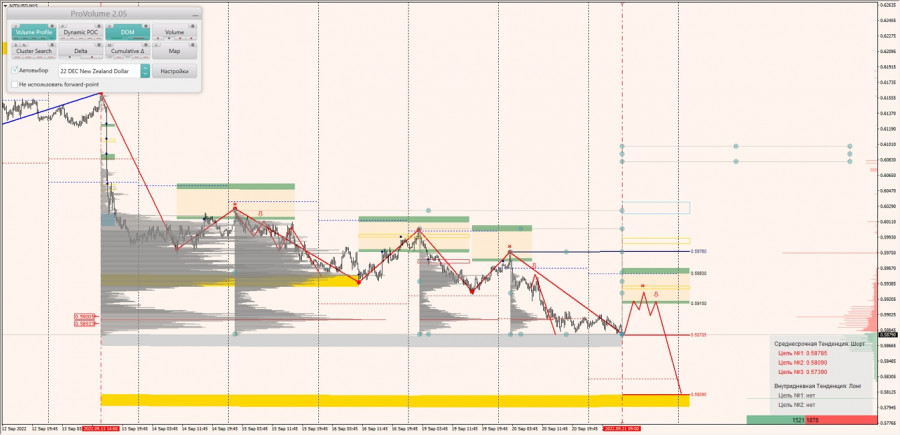 Среднесрочная тенденция: в шорт. Максимальное скопление объемов среднесрочной тенденции расположено в диапазоне по котировкам 0.58923-0.59005. В настоящий момент по паре совершаются инвестиционные операции ниже, указывая на силу продавцов.