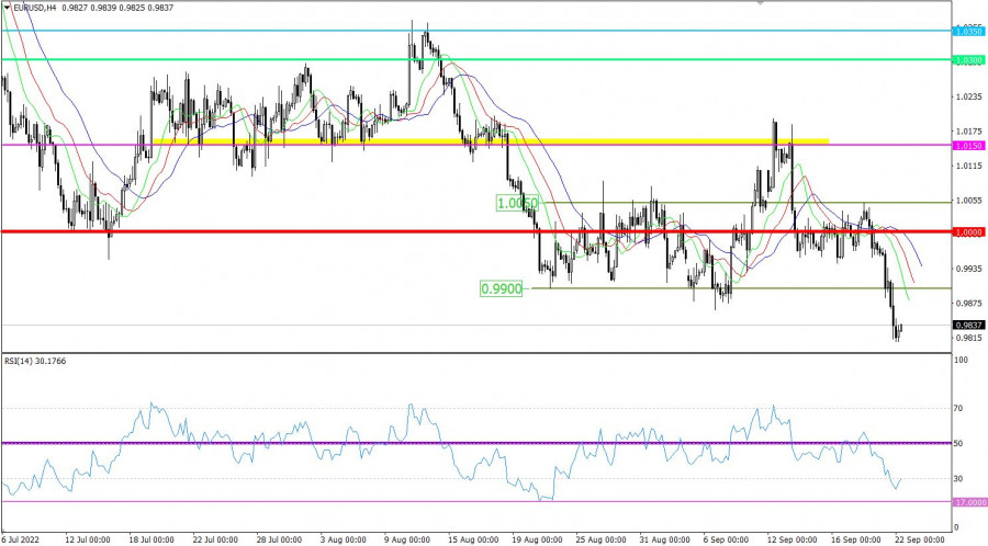Горящий прогноз по EUR/USD от 22.09.2022ИнстаФорекс - Instaforex, 3 года назад Конечно же, рост напряженности и конфронтации в Европе, вызванный решение о проведении референдумов по присоединению к Российской Федерации еще четырех областей, а также частичной мобилизацией, объявленной вчера Владимиром Путиным, оказывают давление на единую европейскую валюту. Да и не только на нее, а практически на все финансовые инструменты. По сути дела, сейчас происходит массовое бегство капиталов в Соединенные Штаты, что приводит к еще большему укреплению доллара. Решение же Федеральной Резервной Системы по повышению ставки рефинансирования на 75 базисных пунктов, и последующее заявление Джерома Пауэлла об оправданности дальнейшего ужесточения монетарной политики, лишь усиливает этот процесс. Да, глава американского регулятора признал факт замедления инфляции, но отметил, что происходит это гораздо медленнее нежели предполагалось. Следовательно, нужно и дальше повышать процентные ставки. Из этого следует вывод, что в ходе следующего заседания Федерального комитета по операциям на открытом рынке, ставка рефинансирования вновь будет повышена на 75 базисных пунктов. Ставка рефинансирования (Соединенные Штаты): Тем не менее не нужно забывать про чрезмерную перекупленность доллара. Так что для дальнейшего его роста рынку необходимо выпустить пар, в виде заметного отскока, или же локальной коррекции. Вполне возможно, что именно это сегодня и произойдет. Поводом станет решение Банка Англии по ставке рефинансирования, которую могут повысить на 50 базисных пунктов. Подобные итоги заседания британского регулятора наверняка приведут к росту фунта, и учитывая потребность рынка в отскоке, он потянет за собой и единую европейскую валюту. Ставка рефинансирования (Великобритания): Валютная пара EURUSD после 3,5 недель хождения вдоль уровня 0.9900 сумела удержаться ниже него в дневном периоде. Этот непростой шаг привел к пролонгации долгосрочного нисходящего тренда, где котировка вновь оказалась на уровнях июля 2002 года. Технический инструмент RSI H4 ввиду интенсивного нисходящего хода цены оказался ниже уровня 30, что указывает на сигнал о перепроданности евро. Скользящие линии MA на Alligator H4 и D1 направлены вниз, что соответствует направлению тренда. Ожидания и перспективы В данной ситуации наблюдается перегрев коротких позиций по евро, что с точки зрения технического анализа может привести к откату цены. В этом случае возможен обратный ход к ранее пройденному уровню 0.9900. Комплексный индикаторный анализ в краткосрочном периоде указывает на покупку ввиду зарождающегося |