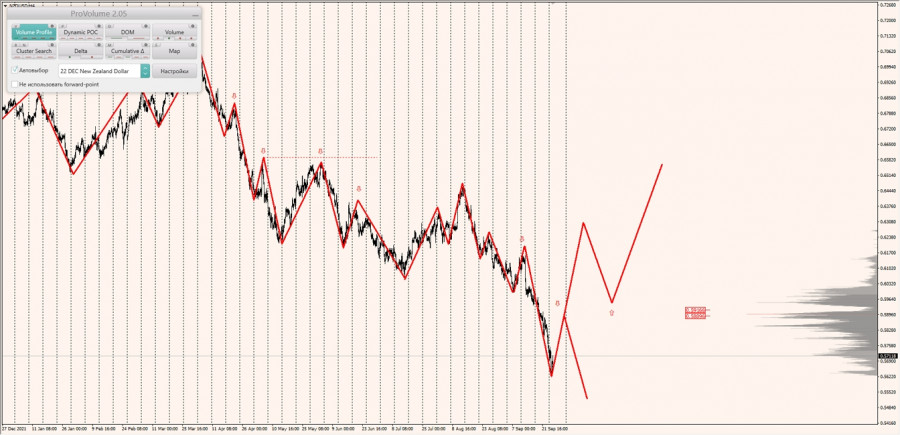 Долгосрочная тенденция: в шорт. Максимальное скопление объемов текущего контракта расположено в диапазоне, по котировкам 0.58896-0.59166. В настоящий момент по паре совершаются инвестиционные операции ниже, указывая на силу продавцов.