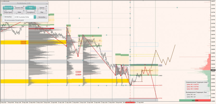 Среднесрочная тенденция: в шорт. Максимальное скопление объемов среднесрочной тенденции расположено в диапазоне, по котировкам0.66325-0.66410. В настоящий момент по паре совершаются инвестиционные операции ниже, указывая на силу продавцов. Объёмы последнего импульса расположены по котировкам 0.64884-0.65008 и в настоящий момент пара торгуется выше, что указывает на слабость продавцов. (первый косвенный сигнал на возможный слом шортового тренда)