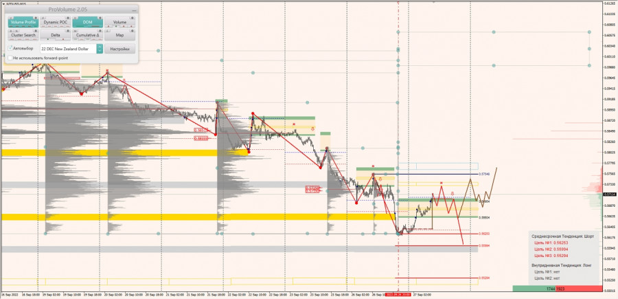 Среднесрочная тенденция: в шорт. Максимальное скопление объемов среднесрочной тенденции расположено в диапазоне, по котировкам0.58333-0.58513. В настоящий момент по паре совершаются инвестиционные операции ниже, указывая на силу продавцов. Объёмы последнего импульса расположены по котировкам 0.57190-0.57258. В настоящий момент по паре совершаются инвестиционные операции внутри указанного диапазона, указывая на временную неопределенность.(косвенный сигнал на возможное окончание шортового тренда)