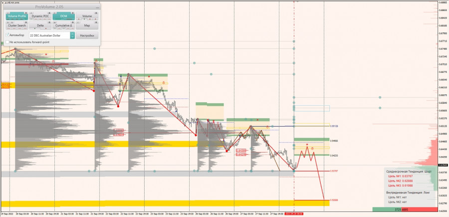 Среднесрочная тенденция: в шорт. Максимальное скопление объемов среднесрочной тенденции расположено в диапазоне по котировкам 0.66325-0.66410. В настоящий момент по паре совершаются инвестиционные операции ниже, указывая на силу продавцов. Объёмы последнего импульса расположены по котировкам 0.64279-0.64399, и в настоящий момент пара торгуется ниже, что указывает на силу продавцов.