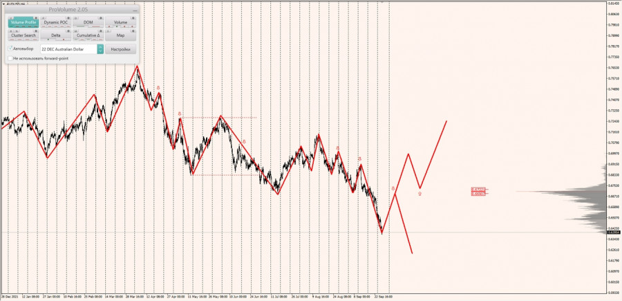 Долгосрочная тенденция: в шорт. Максимальное скопление объемов текущего контракта расположено в диапазоне по котировкам 0.66907-0.67221. В настоящий момент по паре совершаются инвестиционные операции ниже, указывая на силу продавцов.