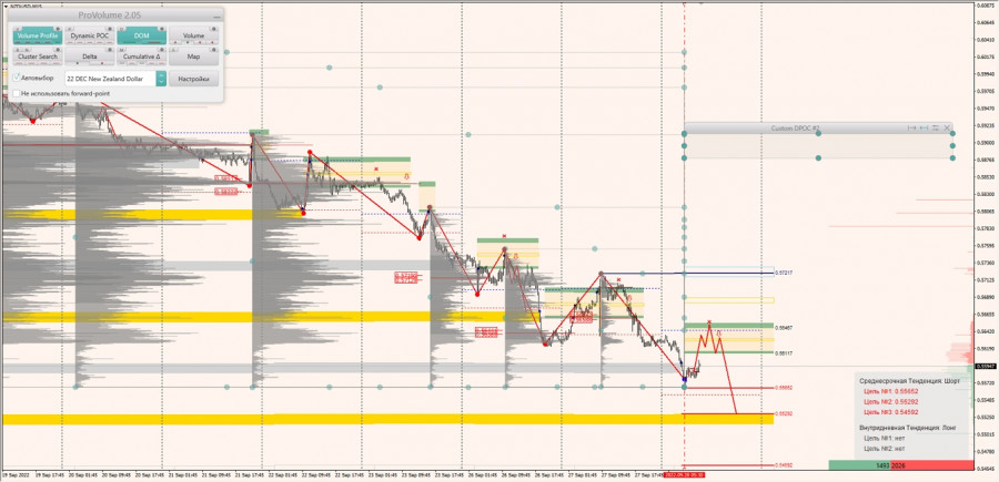 Среднесрочная тенденция: в шорт. Максимальное скопление объемов среднесрочной тенденции расположено в диапазоне по котировкам 0.58333-0.58513. В настоящий момент по паре совершаются инвестиционные операции ниже, указывая на силу продавцов. Объёмы последнего импульса расположены по котировкам 0.56389-0.56441. В настоящий момент по паре совершаются инвестиционные операции ниже, указывая на силу продавцов.