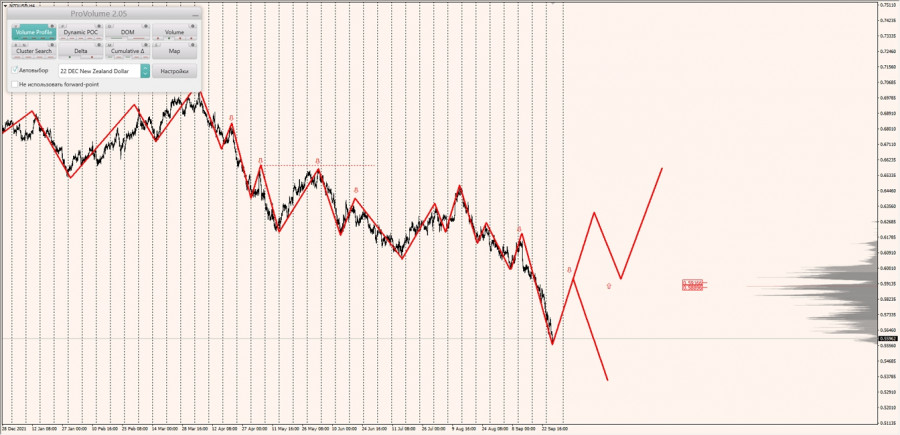 Долгосрочная тенденция: в шорт. Максимальное скопление объемов текущего контракта расположено в диапазоне по котировкам 0.58896-0.59166. В настоящий момент по паре совершаются инвестиционные операции ниже, указывая на силу продавцов.