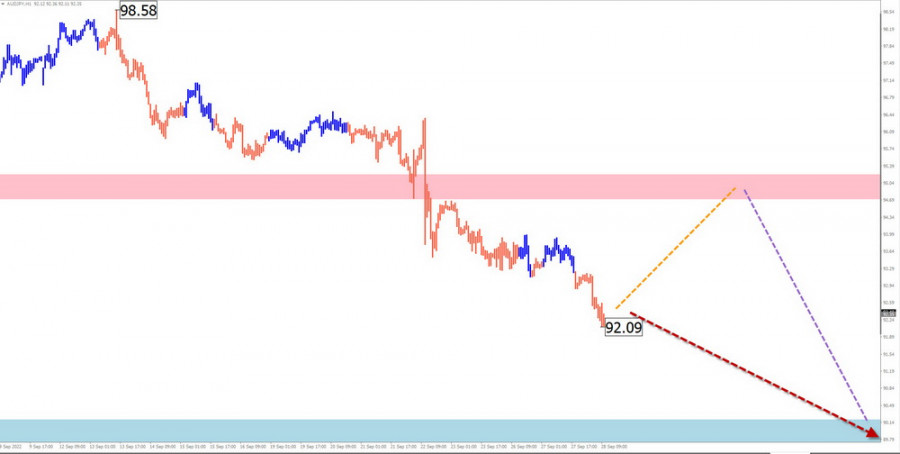 AUD/JPY Краткий анализ: На конце восходящего тренда кросса австралийский доллар/японская иена с апреля текущего года формируется коррекционная волна. Её структура к настоящему времени более всего напоминает сдвигающуюся плоскость. Цена образует заключительную часть волны. Прогноз на неделю: В предстоящий недельный период ожидается общий нисходящий вектор ценового движения. До конца недели не исключён флетовый настрой, с кратковременным подъёмом до зоны сопротивления. Активная фаза снижения более вероятна в начале следующей недели. Зоны потенциального разворота Сопротивление: - 94.70/95.20 Поддержка: - 90.20/89.70 Рекомендации Покупки: высокорискованны и не рекомендуются. Продажи: станут возможными после появления в районе зоны сопротивления сигналов разворота, подтвержденных используемыми вами торговыми системами.