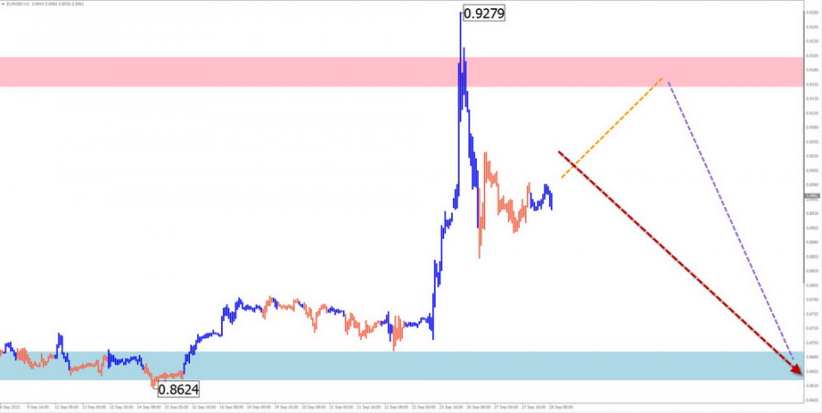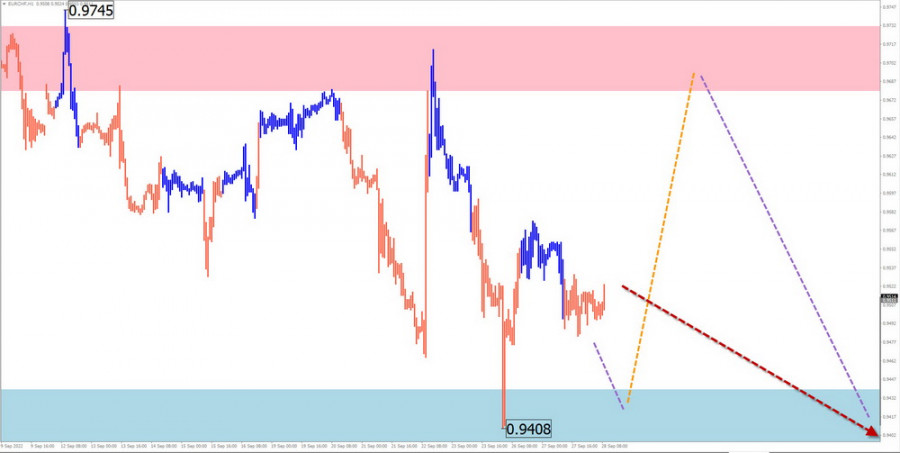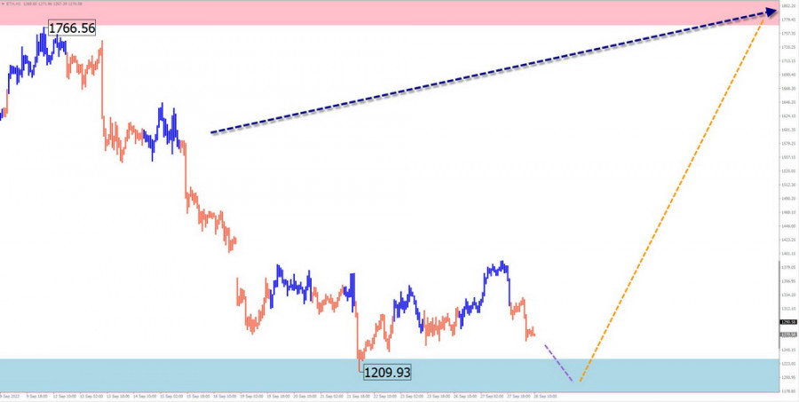 Недельный прогноз по упрощенному волновому анализу EUR/CHF, EUR/GBP, AUD/JPY, #Ethereum от 28 сентябряИнстаФорекс - Instaforex, 3 года назад EUR/CHF Краткий анализ: Котировки кросса евро против швейцарского франка на протяжении последних 4-х лет двигаются на «юг» ценового графика. Последний участок тренда ведёт отсчёт с 9 июня. К настоящему времени его структура не выглядит завершённой. Нисходящий участок от 22 сентября обладает разворотным потенциалом. Цена достигла верхней границы мощной зоны поддержки месячного масштаба графика. Прогноз на неделю: В ближайшие дни ожидается преимущественно боковой курс перемещения котировок между ближайшими зонами встречного направления. До конца текущей недели вероятно повторное давление на зону поддержки. После чего можно рассчитывать на смену вектора, с ростом цены вплоть до зоны сопротивления. Зоны потенциального разворота Сопротивление: - 0.9680/0.9730 Поддержка: - 0.9440/0.9390 Рекомендации Продажи: будут возможны дробным лотом в рамках отдельных сессий. Покупки: могут быть рекомендованы после появления в районе зоны поддержки подтвержденных сигналов разворота. EUR/GBP Краткий анализ: Ценовые колебания кроссовой пары евро/английский фунт идут преимущественно в боковой плоскости. Незавершенная волновая модель нисходящая, с точкой отсчета в марте 2020 года. В структуре волны близится к завершению средняя часть (В). Нисходящий участок от 26 сентября обладает разворотным потенциалом. При его подтверждении это станет началом заключительной части (С). Прогноз на неделю: Вплоть до уикенда цену кросса ожидает перемещение с восходящим вектором, с ростом курса до зоны сопротивления. В начале следующей недели высока вероятность разворота и возобновление нисходящего направления. Зоны потенциального разворота Сопротивление: - 0.9150/0.9200 Поддержка: - 0.8690/0.8630 Рекомендации Покупки: могут применяться дробным лотом в рамках отдельных сессий. Продажи: станут возможными после появления в районе зоны сопротивления подтвержденных сигналов разворота.