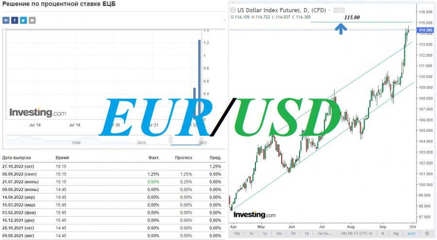 EUR/USD: ждать ли падения в сторону 20-летних минимумов?ИнстаФорекс - Instaforex, 3 года назад Доллар бодро начал неделю, продолжая укрепляться и сегодня. Его индекс DXY установил в среду очередной рекорд, достигнув отметки 114.72. Вчерашняя позитивная макро статистика, поступившая из США, отразила устойчивость американской экономики в условиях растущей по всему миру инфляции и высокой геополитической напряженности. Так, заказы на товары длительного пользования (без учета оборонных и авиационных) выросли в августе на +1,3% (против прогноза о росте на +0,2% и предыдущего роста на +0,3%). Показатель базовых заказов на товары длительного пользования снизился на -0,2%, что меньше ожидаемого снижения на -0,4%. При этом, отчет по рынку жилья в США отразил значительный прирост количества проданных в августе новых домов (с 532,0 тыс в июле до 685,0 тыс). Кроме того, опубликованные также во вторник, данные показали более выраженное, чем ожидалось, улучшение потребительских настроений в сентябре. Отмечена восходящая коррекция индекса доверия потребителей от Conference Board до 108,0 пункта с 103,6 пункта месяцем ранее. Это самый высокий уровень за последние пять месяцев, а в сочетании со значительным ростом в августе индекс на 12,7 пункта выше, чем два месяца назад, отмечают экономисты. Инвесторы по-прежнему ожидают дальнейшего ужесточения монетарной политики со стороны ФРС. Согласно недавнему опросу агентства Reuters, «год завершится на уровне 4,25%-4,50% ставки ФРС. Если это произойдет, то это будет самая высокая ставка с начала 2008 года, до начала мирового финансового кризиса, и на 75 базисных пунктов выше, чем 3,50%-3,75%, прогнозируемые всего две недели назад». Индекс доллара DXY уже достиг сегодня нового максимума в непосредственной близости от очередной «круглой» отметки 115.00 и, похоже, ему ничто не мешает подняться еще выше, вплоть до рекордных максимумов 20-летней давности вблизи отметок 120.00, 121.00. Инвесторы активно избегают покупок на фондовом рынке, а растущие геополитическая напряженность и опасения по поводу замедления темпов роста мировой экономики дополнительно оказывают доллару поддержку, повышая на него спрос как на актив-убежище. Сегодня в начале американской торговой сессии выйдут данные по торговому балансу и продажам домов в США за август, а в 14:15 (GMT) выступит глава ФРС Джером Пауэлл (о других важных экономических событиях сегодняшнего дня и недели см. в Важнейшие экономические события недели 26.09.2022 – 02.10.2022). Что же касается евро, то он продолжает активно снижаться против своего основного конкурента на валютном рынке доллара. Несмотря на то, что глава Европейского центрального банка Кристин Лагард вчера и сегодня отметила готовность регулятора продолжить повышение процентной ставки, несмотря на усиление рисков появления рецессии в экономике региона, евро испытывает давление как от слабой макро статистики, поступающей из Еврозоны (в частности, немецкий индекс делового климата (от IFO) в сентябре показал снижение с 88,6 до 84,3 при прогнозе в 87,1, а индикатор оценки текущей ситуации резко снизился с 97,5 до 94,5, при прогнозе снижения лишь до 96,0. Индекс экономических ожиданий опустился с 80,5 до 75,2 при прогнозе 78,6), так и на фоне высокой геополитической напряженности в Европе из-за событий на Украине и в связи с разрушением трёх ниток газопроводов системы «Северный поток» в районе датског