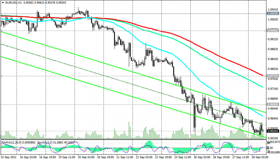 EUR/USD: технический анализ и торговые рекомендации на 28.09.2022ИнстаФорекс - Instaforex, 3 года назад Как мы отметили в нашем сегодняшнем «Фундаментальном анализе», «в целом, сохраняется нисходящая динамика EUR/USD». Пара остается в зоне медвежьего рынка, как долгосрочного (ниже уровней сопротивления 1.1150 (ЕМА144 на недельном графике), 1.1265 (ЕМА200 на недельном графике), 1.0570 (ЕМА200 дневном графике), так и краткосрочного (ниже уровней сопротивления 0.9774 (ЕМА200 на 1-часовом графике), 0.9956 (ЕМА200 на 4-часовом графике). Если доллар сегодня окажется под давлением (в случае «голубиной» риторики Пауэлла в ходе его сегодняшнего выступления в 14:15 GMT), то у EUR/USD может появиться шанс немного восстановиться после сильнейшего падения на фиксации части длинных позиций по USD. В этом случае вероятен коррекционный рост к уровню сопротивления 0.9774. Его пробой станет сигналом для реализации альтернативного сценария, подразумевающего рост EUR/USD (с целью на уровне сопротивления 1.0025). В основном же сценарии ожидаем дальнейшего снижения. Ближайшая цель – локальный минимум и уровень поддержки 0.9535. Далее – в сторону отметок 0.8700, 0.8600. *) см. также EUR/USD: валютная пара (характеристики, рекомендации) Уровни поддержки: 0.9535, 0.9500, 0.9400, 0.9300, 0.9200, 0.9000 Уровни сопротивления: 0.9615, 0.9700, 0.9744, 0.9900, 0.9956, 1.0000, 1.0025, 1.0195, 1.0200
