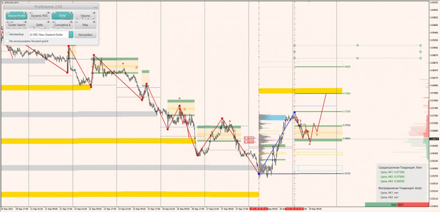 Среднесрочная тенденция: в лонг. Максимальное скопление объемов среднесрочной тенденции расположено в диапазоне по котировкам 0.56600-0.56701. В настоящий момент по паре совершаются инвестиционные операции внутри указанного диапазона, указывая на временную неопределенность.