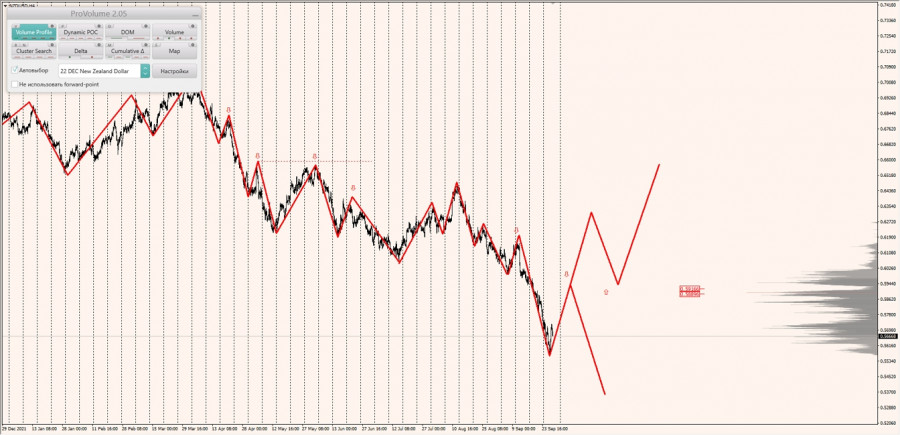 Долгосрочная тенденция: в шорт. Максимальное скопление объемов текущего контракта расположено в диапазоне по котировкам 0.58896-0.59166. В настоящий момент по паре совершаются инвестиционные операции ниже, указывая на силу продавцов.