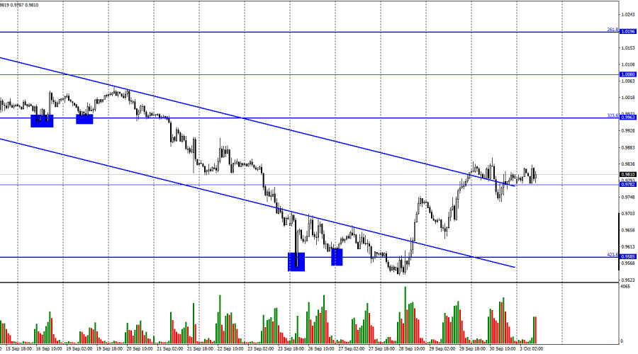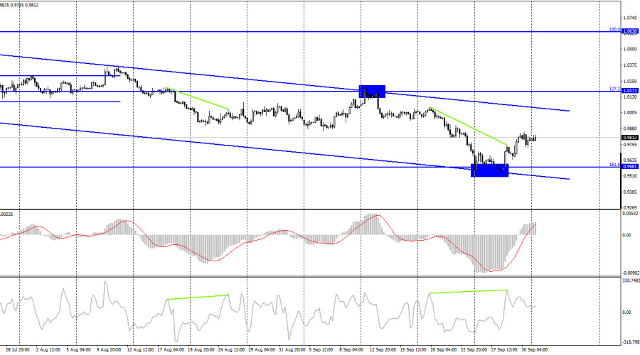 EUR/USD. 3 октября. Неделя для европейской валюты начинается спокойноИнстаФорекс - Instaforex, 3 года назад Добрый день, уважаемые трейдеры! Пара EUR/USD в пятницу выполнила разворот в пользу доллара США и ненадолго закрепилась под уровнем 0,9782. Но чуть ранее было выполнено закрытие над трендовым коридором, которое позволяет рассчитывать трейдерам на дальнейший рост в направлении следующего уровня коррекции 323,6% - 0,9963. После того как было выполнено закрытие над нисходящим трендовым коридором, шансы евро на дальнейший рост действительно выросли, но слишком много факторов сейчас приходится учитывать трейдерам, поэтому я не думаю, что рост валюты ЕС теперь не вызывает никаких сомнений. Геополитика, экономика, политика сейчас находятся в таком состоянии, что курс может измениться на 180 градусов в любой момент. Экономические перспективы Евросоюза остаются весьма туманными, так как после диверсии на трубопроводах «Северный поток» Европа может остаться на долгое время без российского газа, а ее экономика, напомню, очень зависима от этого вида топлива. Поэтому грядущая зима может стать тяжелым испытанием для европейской экономики, а ВВП может значительно снизиться. Именно это возможное снижение и вызывает массу споров и дискуссий среди трейдеров. Американская экономика уже начала сокращаться, но ее сокращение носит как бы плановый характер. Ни для кого не секрет, что основная проблема США – высокая инфляция, с которой активно борется ФРС. Сокращение экономики – это последствие даже не действий регулятора, а последствие тех стимулирующих программ, которые увеличили денежную массу в США в последние годы. Поэтому и высокая инфляция, и будущее сокращение ВВП были весьма предсказуемы. Падение экономического роста в Евросоюзе связывают с энергетическим кризисом, глубину которого невозможно просчитать или предсказать. А помимо этого, ЕЦБ тоже начал повышать ставки, следовательно, удар по европейской экономике – двойной. Другими словами, если американская экономика может выйти из рецессии, как только ФРС перестанет повышать процентную ставку, то европейская экономика из-за недостатка газа или его высокой стоимости может надолго застрять в спаде. Этот фактор, я думаю, может сдерживать рост евро. На 4-часовом графике пара выполнила новый разворот в пользу валюты ЕС и возобновила процесс роста в направлении верхней линии нисходящего трендового коридора. Коридор продолжает характеризовать настроение трейдеров как «медвежье», что заставляет меня с осторожностью относиться ко всякого рода прогнозам о будущем сильном росте евровалюты. Закрепление курса пары над коридором повысит вероятность роста евро. Отчет Commitments of Traders (COT):