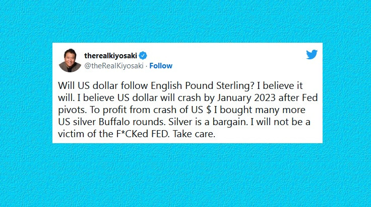 В недавнем твите Киосаки написал: Последует ли доллар США за английским фунтом стерлингов? Я верю, что так и будет. И считаю, что доллар США рухнет к январю 2023 года после разворота ФРС.