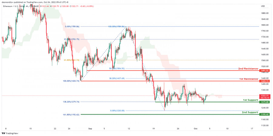 ETH/USD: ожидается формирование бычьего импульса. Прогноз на 4 октября 2022ИнстаФорекс - Instaforex, 3 года назад На 4-часовом графике пара ETH/USD торгуется в медвежьем тренде. В течение последних двух недель, включая понедельник этой недели, цена консолидировалась выше 1-го уровня поддержки 1279.00, соответствующего уровню Фибоначчи 138.2%. Сейчас цена закрепилась выше облака Ишимоку, что указывает на возможное изменение тренда в краткосрочной перспективе. Ожидается, что цена вернется к 1-му уровню сопротивления 1420.74, который соответствует уровням Фибоначчи 100% и 38.2%. Рекомендации по торговле Вход: 1320.94 Условия для входа: вход при цене выше облака Ишимоку, что указывает на бычий рынок Тейк-профит: 1420.74 Условия для фиксации прибыли: 100% уровень расширения Фибоначчи и предыдущий уровень свинг-лоу Стоп-лосс: 1220.00 Условия для активации ордера стоп-лосс: самый последний минимум Материал предоставлен компанией InstaForex - www.instaforex.com |