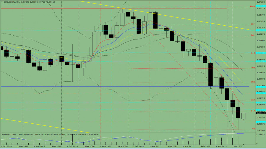 Технический анализ на октябрь месяц 2022 по валютной паре EUR/USDИнстаФорекс - Instaforex, 3 года назад Трендовый анализ. В октябре от уровня 0.9804 (закрытие сентябрьской месячной свечи) движение вверх до цели 0.9994 – исторический уровень сопротивления (голубая пунктирная линия). При тестировании этого уровня продолжение движения вверх с целью откатный уровень 23.6%, 1.0198 (красная пунктирная линия). По достижении этого уровня продолжение верхней работы до цели 1.0373 – исторический уровень сопротивления (голубая пунктирная линия). При тестировании этого уровня возможен откат вниз. Рис. 1 (месячный график). Индикаторный анализ: - индикаторный анализ – вверх; Вывод по комплексному анализу: вероятней всего верхняя работа. Общий итог расчёта свечи валютной пары EUR/USD по месячному графику: цена, вероятнее всего, будет иметь восходящую тенденцию с отсутствием первой нижней тени (первая неделя месяца – белая) у месячной белой свечи и наличием второй верхней тени (последняя неделя - чёрная). Общий сценарий: от уровня 0.9804 (закрытие сентябрьской месячной свечи) движение вверх до цели 0.9994 – исторический уровень сопротивления (голубая пунктирная линия). При тестировании этого уровня продолжение движения вверх с целью откатный уровень 23.6%, 1.0198 (красная пунктирная линия). По достижении этого уровня продолжение верхней работы до цели 1.0373 – исторический уровень сопротивления (голубая пунктирная линия). При тестировании этого уровня возможен откат вниз. Альтернативный сценарий: от уровня 0.9804 (закрытие сентябрьской месячной свечи) движение вверх с целью 1.0198 – откатный уровень 23.6% (красная пунктирная линия). В случае тестирования этого уровня работа вниз с целью 0.9994 – исторический уровень поддержки (синяя пунктирная линия). От этого уровня продолжение верхней работы