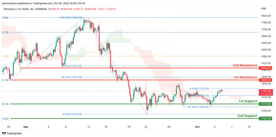 ETH/USD: возможен разворот. Прогноз на 5 октября 2022ИнстаФорекс - Instaforex, 3 года назад На 4-часовом графике пара ETH/USD в настоящее время торгуется в нисходящем направлении. Цена недавно закрылась выше индикатора Облако Ишимоку, что указывает на потенциальный разворот краткосрочного тренда. Пара ETH/USD продолжила рост от 1-го уровня поддержки 1279.66, соответствующего уровню расширения Фибоначчи 138.2%. Ожидается, что цена развернется от первоначального уровня сопротивления 1420.74 к уровням Фибоначчи 100% и 38.2%. Рекомендации по торговле Вход: 1329.18 Условия для входа: 38.2% уровень коррекции Фибоначчи Тейк-профит: 1420.74 Условия для фиксации прибыли: 100% уровень расширения Фибоначчи и предыдущий уровень свинг-лоу Стоп-лосс: 1220.00 Условия для активации ордера стоп-лосс: последний лоу Материал предоставлен компанией InstaForex - www.instaforex.com |