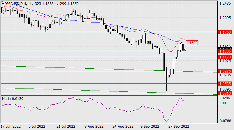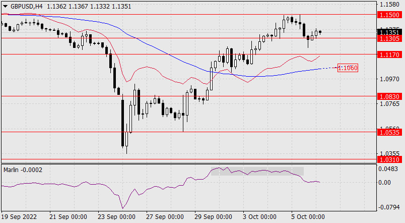 Прогноз по GBP/USD на 6 октября 2022 годаИнстаФорекс - Instaforex, 3 года назад Вчера британский фунт обозначит свою цель, к которой так усиленно стремился последние 7 дней – индикаторную линию Крузенштерна дневного масштаба. На уровне 1.1500 эта встреча состоялась, после чего цена развернулась вниз. Поддержка 1.1305 не позволила цене с первой попытки продолжить снижение, на текущий момент цена консолидируется на данном уровне. Уход под неё открывает цель 1.1170, затем, когда и осциллятор Марлин дневного масштаба уйдёт в отрицательную область, продолжится поход к цели 1.0830.