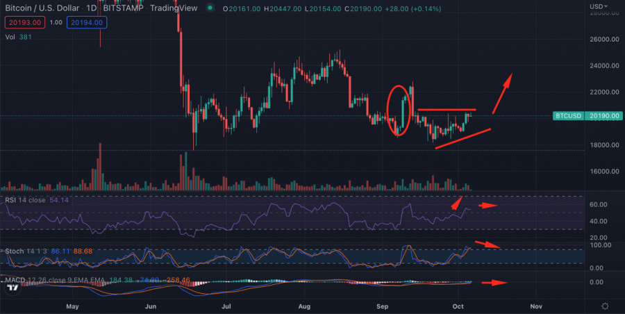 На рынке акций формируются бычьи настроения: как это повлияет на Биткоин?ИнстаФорекс - Instaforex, 3 года назад За время медвежьего тренда рынок акций потерял более $40 триллионов капитализации. Основные индексы обновили локальные минимумы и негативно влияли на криптовалюты. Основной причиной медвежьего рынка принято считать агрессивную политику ФРС из-за высокого уровня инфляции. Но также не стоит забывать про кризис энергоресурсов и продолжающуюся войну на Украине с постоянными намеками на ядерную эскалацию. Причины бычьих настроенийВ октябре ситуация может измениться по нескольким фундаментальным причинам. Во-первых, исторически октябрь выступал бычьим месяцем, особенно для фондовых индексов. Это вселяет в инвесторов уверенность в продолжительном восходящем тренде в ближайшем будущем. Во-вторых, ООН обратилась к ФРС и Центробанкам стран с просьбой прекратить повышать ключевые ставки из-за усугубляющейся рецессии мировой экономики. До конца неясно, насколько эффективным будет обращение ООН, но долю позитива на рынки оно принесло. И в-третьих, важно понимать, что рынки, в том числе криптовалютный, достигли определенного рыночного дна и перешли к длительной консолидации. В итоге складывается ситуация, когда медведи исчерпали свой потенциал, а быки лишь начинают его формировать. Bank of America также предвидит ралли рынка и присоединяется к общим бычьим настроениям на фонде. Аналитики BofA ссылаются на "внутренний потенциал" рынка акций, ведь более 90% ценных бумаг на NYSE показали двухдневный рост. Этого не случалось с декабря 2012. Анализ SPXФондовый индекс возобновил восходящее движение и достиг уровня $3780. В ближайшее время котировки S&P 500 продолжат восходящее движение к уровню сопротивления $3800-$3950. Актив показывает рост на протяжении трех дней подряд без существенного прироста объемов. Индекс RSI и стохастик указывают на снижение покупательской активности, но MACD формирует широкое бычье пересечение, что является мощным сигналом к росту. Это означает изменение среднесрочной динамики движения цены и рост покупательских интересов в отношении SPX. Анализ BTC/USDБиткоин пока никак не отреагировал на восходящее движение SPX, что указывает на ослабление корреляции. Объемы торгов криптовалюты также не растут, из-за чего актив остается в рамках диапазона $19,5k-$20,4k. Мы многократно упоминали о растущих объемах BTC, и если они реальны, то в ближайшее время мы должны увидеть пробоя линии нисходящего тренда на 1D. Технические индикаторы Биткоина указывают на движение по флету после непродолжительного и слабого бычьего импульса. Метрики отображают кризис ликвидности и отсутствие объемов, необходимых для продолжительного роста цены. За последние две недели мы видели растущие объемы торгов и мощный откуп зоны поддержки $19,1k. Учитывая это, нет сомнений в том, что сильный покупатель на рынке присутствует. Вопрос лишь в том, будет ли сильный рыночный игрок поддерживать возможность реализации среднесрочного бычьего импульса. Подводные камниНесмотря на определенную эйфорию, связанную с завершением сложного сентября, ситуация кардинальным образом не изменилась. Во-первых, индекс доллара США сформировал "бычье поглощение" по итогам 5 октября. Это означает, что в краткосрочной перспективе у индекса хватает потенциала повторно достичь 114. Во-вторых, председат