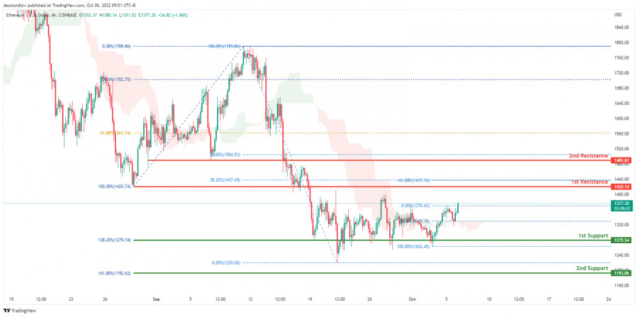 ETH/USD: ожидается формирование бычьего импульса. Прогноз на 6 октября 2022ИнстаФорекс - Instaforex, 3 года назад На 4-часовом графике пара ETH/USD торгуется в медвежьем тренде. Однако цена закрылась выше Облака Ишимоку, что указывает на то, что рынок вскоре может стать бычьим. Последние три недели цена консолидировалась в области 1-го уровня поддержки 1279.54. Ожидается, что цена продолжит рост к 1-му уровню сопротивления 1420.74, который соответствует предыдущему уровню свинг-лоу. Рекомендации по торговле Вход: 1437.69 Условия для входа: пересечение уровня коррекции Фибоначчи 38.2% и уровня расширения Фибоначчи -61.8% Тейк-профит: 1193.06 Условия для фиксации прибыли: уровень расширения Фибоначчи 161.8% Стоп-лосс: 1520.00 Условия для активации ордера стоп-лосс: чуть выше уровня коррекции Фибоначчи 50% Материал предоставлен компанией InstaForex - www.instaforex.com |