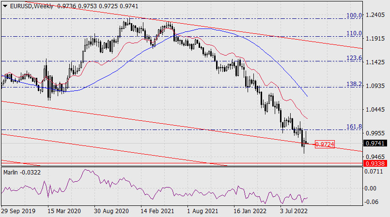 Прогноз по EUR/USD на 10 октября 2022 годаИнстаФорекс - Instaforex, 3 года назад В прошедшую пятницу евро снизился на 52 пункта, а сегодня утром цена достигла поддержки важнейшей линии глобального ценового канала старшего таймфрейма на отметке 0.9724. После закрепления цены под данной линией на недельном масштабе вероятно дальнейшее продвижение цены вниз до целевого уровня 0.9338.