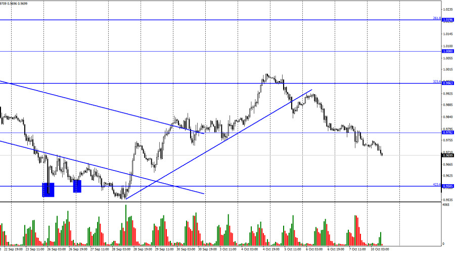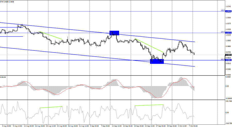 EUR/USD. 10 октября. Тихо, неспешно, но вниз, вниз, внизИнстаФорекс - Instaforex, 3 года назад Добрый день, уважаемые трейдеры! Пара EUR/USD продолжала в пятницу процесс падения и выполнила закрепление под уровнем 0,9782. Таким образом, падение котировок может теперь продолжаться в направлении следующего уровня коррекции 423,6% - 0,9585, около которого завершилось прошлое падение. Как видим, трейдеры-медведи лишь на недолгий период времени отступили, но сейчас вновь атакуют. Следовательно, можно ожидать нового обновления лоу за 20 лет. В пятницу все внимание трейдеров было приковано к Америке. Сразу три важных отчета стали известны и их значения можно назвать интересными. Наибольший интерес вызвали даже не Пэйроллы, а безработица. Месяцем ранее она выросла до 3,7%, но пятничный отчет показал ее снижение обратно на 3,5%. Таким образом, безработица не растет, а у ФРС нет оснований переживать за «плохое» состояние рынка труда США. Отчет по Пэйроллам тоже оказался довольно неплохим. Было создано 263 тысячи новых рабочих мест, что в целом соответствовало ожиданиям трейдеров. Заработные платы выросли в сентябре на 0,3%, что тоже соответствовало ожиданиям. Таким образом, из трех отчетов ни один не был слабым, а новый рост доллара при подобном информационном фоне был ожидаем. Однако началась новая неделя, а доллар все еще продолжает расти. Я могу предположить, что мы все еще наблюдаем реакцию трейдеров на пятничные данные, однако евро может падать и без этого влияния, так как геополитическая обстановка ухудшается. Что касается ФРС, то теперь мы, вероятнее всего, увидим четвертое подряд повышение ставки на 0,75%, что является максимально возможным в текущих условиях ужесточением денежно-кредитной политики. Этот факт может продолжать поддерживать американскую валюту. На этой неделе выйдет отчет по инфляции в США, но трейдеры не ждут ее сильного снижения. А этот факт тоже играет в пользу доллара. Чем медленнее падает инфляция, тем больше оснований у ФРС продолжать повышать ставку, что очень хорошо для доллара. На 4-часовом графике пара выполнила новый разворот в пользу американского доллара и начала новый процесс падения в направлении уровня Фибо 161,8% - 0,9581 и в пределах нисходящего трендового коридора. Таким образом, настроение трейдеров на этом графике остается «медвежьим» без каких-либо вопросов. Лишь закрепление над нисходящим коридором позволит рассчитывать на ощутимый рост евровалюты. Отчет Commitments of Traders (COT):