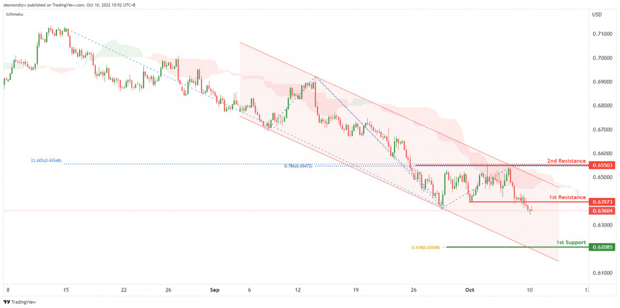 AUD/USD: ожидается формирование медвежьего импульса. Прогноз на 10 октября 2022 г.ИнстаФорекс - Instaforex, 3 года назад На 4-часовом графике пара AUD/USD движется ниже Облака Ишимоку и в рамках нисходящего канала, что указывает на медвежий импульс. Ожидается, что цена может вырасти до 1-го уровня сопротивления 0.63973, соответствующего предыдущему уровню свинг-лоу, а затем упасть до 1-го уровня поддержки 0.62085, который соответствует проекции Фибоначчи 61.8%. В качестве альтернативы цена может подняться до 2-го уровня сопротивления 0.65503, соответствующего уровню коррекции Фибоначчи 23.6% и проекции Фибоначчи 78.6%. Торговая рекомендация Вход: 0.63973 Условия для входа: предыдущий уровень свинг-лоу Тейк-профит: 0.62085 Условия для фиксации прибыли: 61.8% проекция Фибоначчи Стоп-лосс: 0.65503 Условия для активации ордера стоп-лосс: 23.6% уровень коррекции Фибоначчи и 78.6% проекция Фибоначчи Материал предоставлен компанией InstaForex - www.instaforex.com |